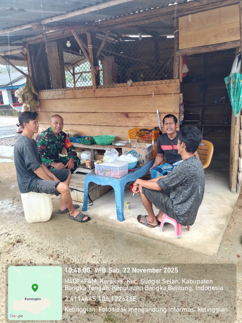 Kerakas, kejarberita-news.com – Babinsa Desa Kerakas, Koramil 413-08/Sungai Selan, Kopka Sujarwo, proaktif melaksanakan Komunikasi Sosial dengan warga setempat untuk meningkatkan keakraban sekaligus menyosialisasikan upaya pencegahan bencana di musim penghujan di warung milik Saudara Versi di Desa Kerakas, Sabtu (22/11/2025)