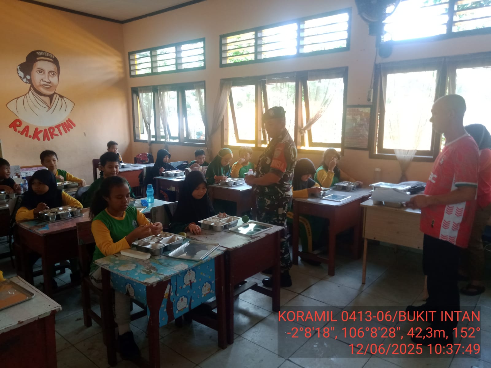 BukitIntan,Kejarberitanews.com-Sukseskan Program Makan bergizi gratis babinsa 413-06/Bukit intan turun langsung bagikan makan bergizi gratis (MBG) bertempat di SDN 20 kelurahan bacang, Kamis (12/06/2025)