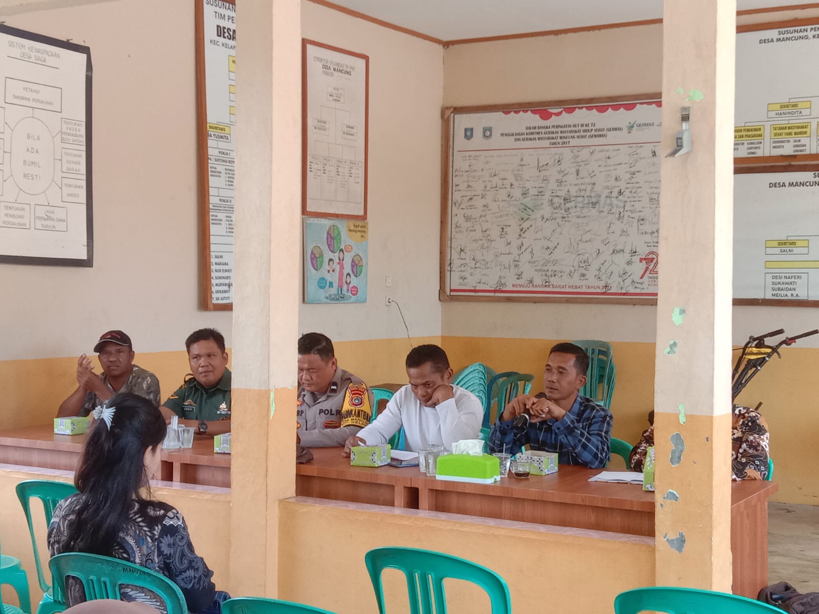 Rapat diawali dengan pembukaan, doa bersama, dilanjutkan dengan sambutan-sambutan dari Ketua BPD, Pendamping Desa Mancung, dan Babinsa Serda Arwin, kemudian diakhiri dengan penutup dan foto bersama.