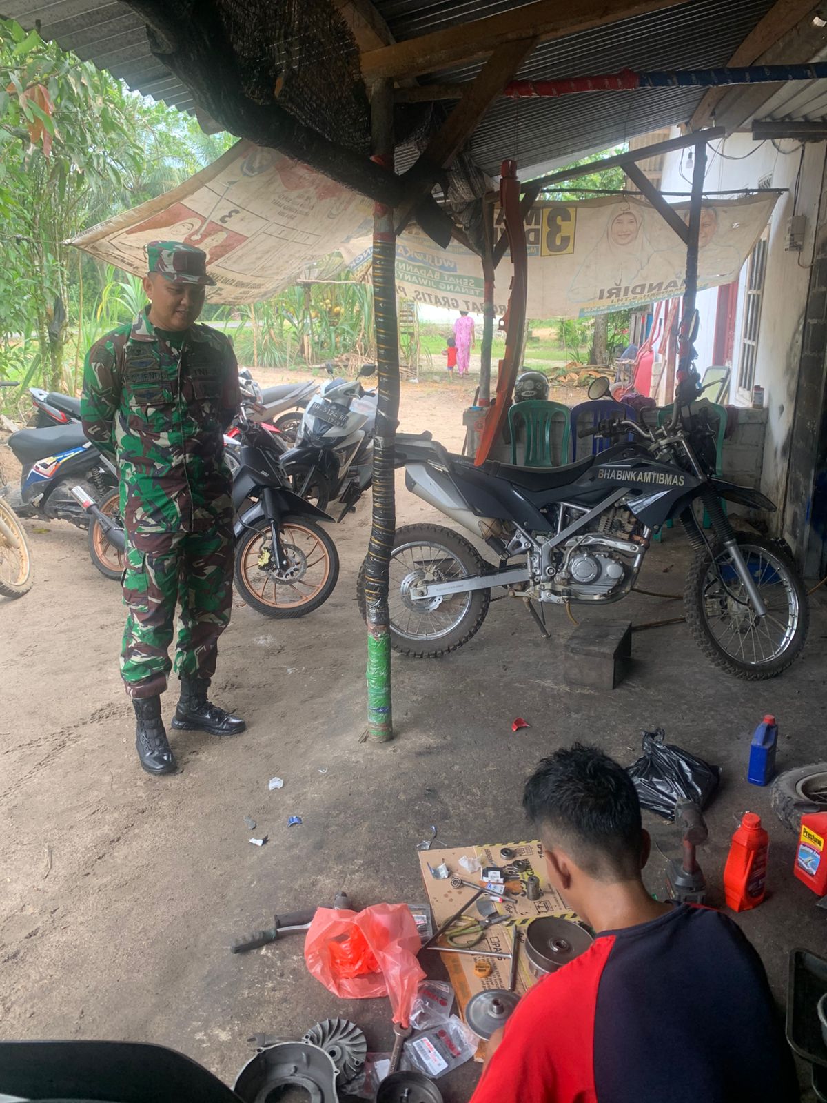 Bangka Barat, kejarberita-news.com – Babinsa Koramil 431-01/Jebus, Serda Romendo, melaksanakan kegiatan Komunikasi Sosial (Komsos) di bengkel milik Bapak Indra, yang berlokasi di Desa Sungai Buluh, Kecamatan Jebus, Kabupaten Bangka Barat, pada Minggu (28/12/2025).