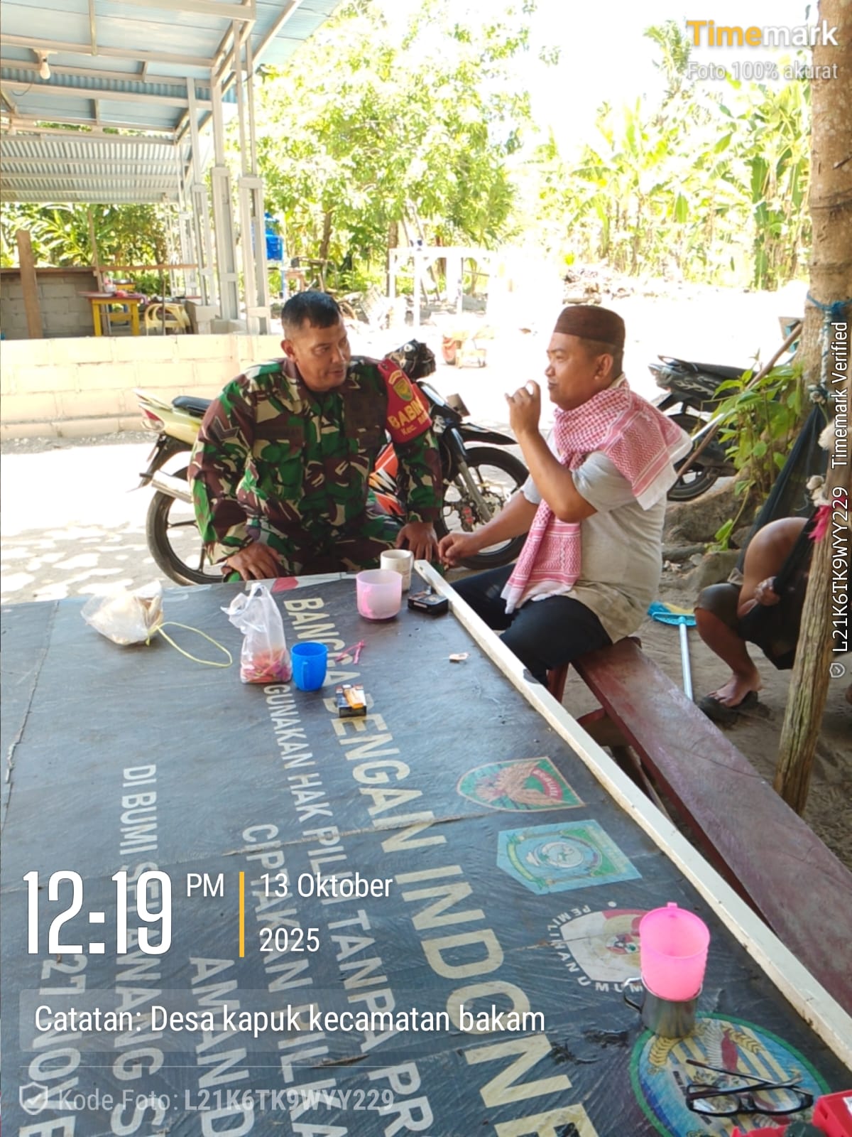 Bangka, kejarberita-news.com – Komsos kembali menjadi kegiatan rutin yang diemban oleh jajaran TNI AD di wilayah teritorial. Hari ini, Sertu Turahman, Babinsa Desa Kapuk dari Koramil 413-01/Sungailiat, sukses melaksanakan Komsos dengan salah satu tokoh agama di Desa Kapuk, Kecamatan Bakam, Senin (13/10/2025)