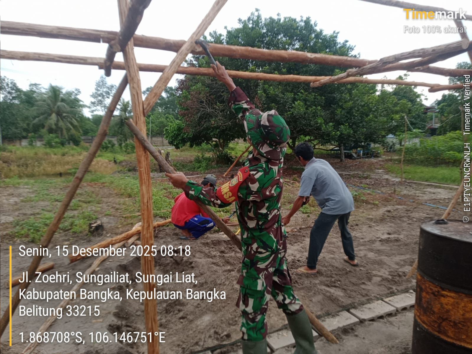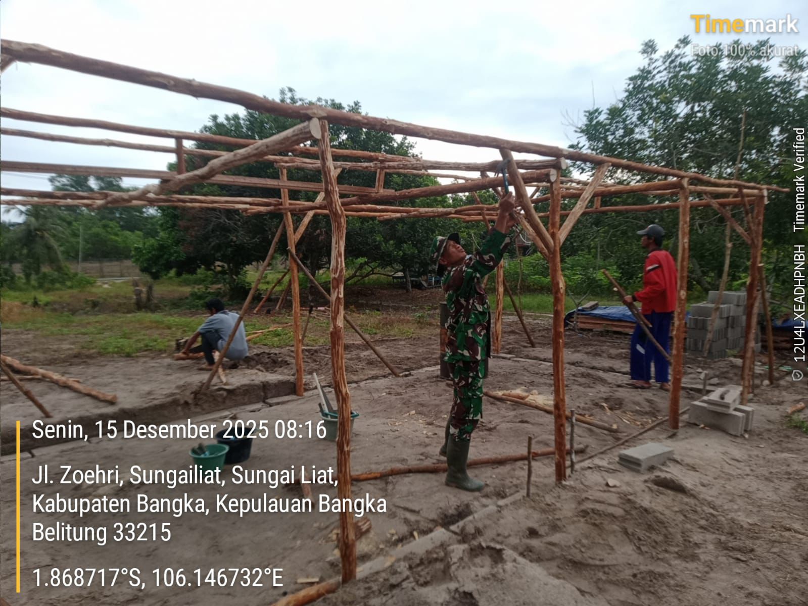 Sungailiat, kejarberita-news.com – Wujud nyata kepedulian TNI terhadap masyarakat kembali ditunjukkan oleh Babinsa Kelurahan Jelitik, Koramil 0413-01/Sungailiat. Pada Senin, 15 Desember 2025, Serka Nurahman melaksanakan kegiatan komunikasi sosial (komsos) dengan membantu warga binaan mendirikan rumah tempat tinggal di wilayah binaannya.