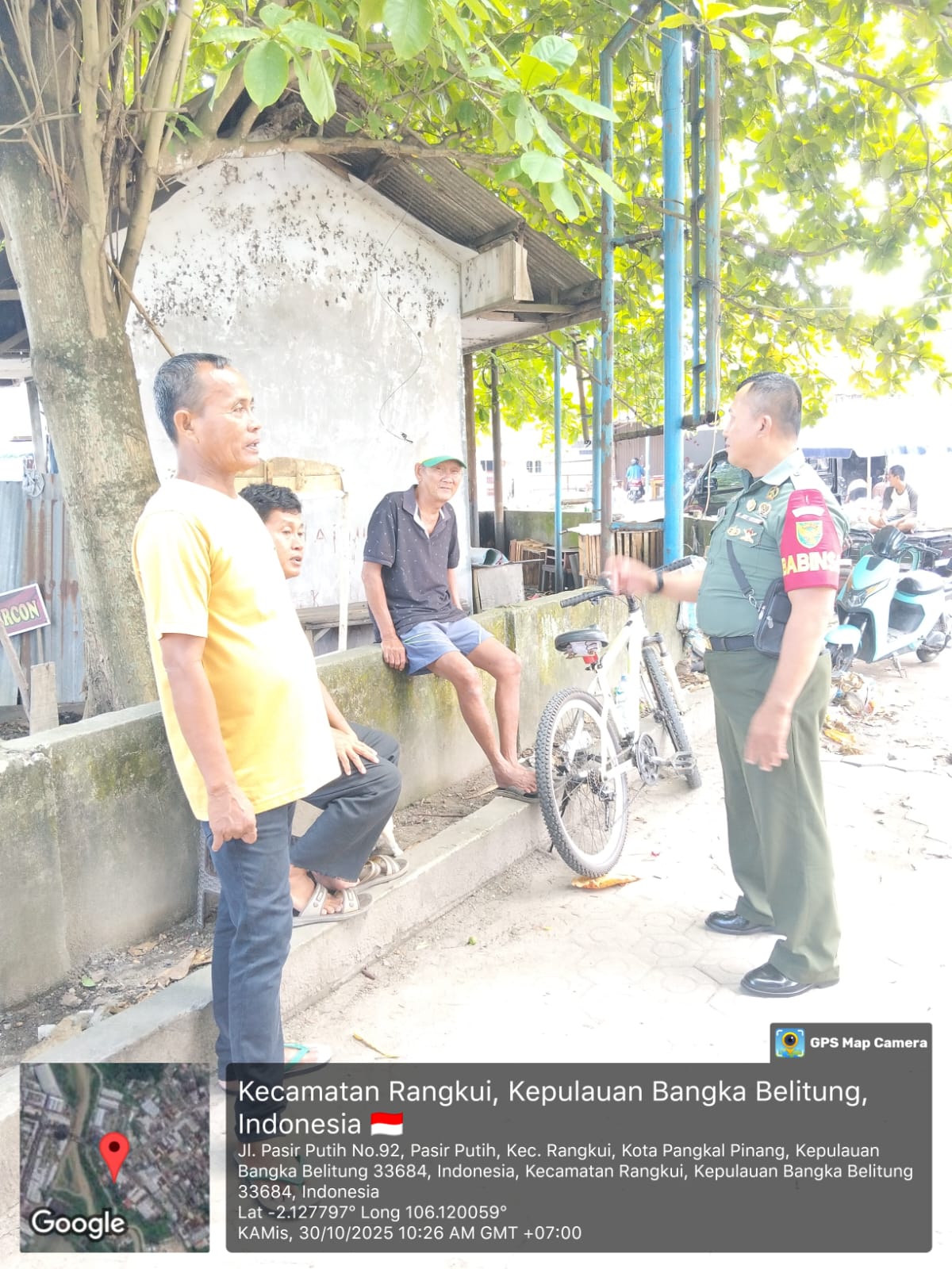 Pangkalpinang, kejarberita-news.com – Dalam rangka menjaga stabilitas keamanan dan ketertiban masyarakat di wilayah binaan, Babinsa Kelurahan Pasir Putih dari Koramil 413-06/Bukit Intan, Serka Sunarto, melaksanakan kegiatan Komunikasi Sosial dengan tokoh lingkungan setempat, Kamis (30/10/2025)