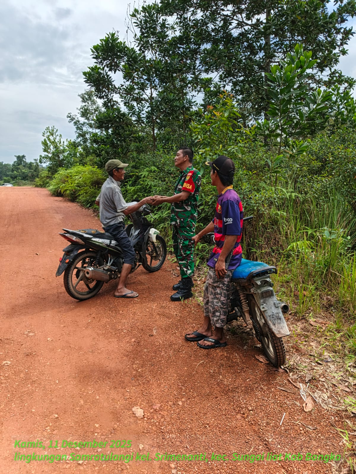 Srimenanti, kejarberita-news.com – Babinsa Kelurahan Srimenanti, Sertu Jamhur dari Koramil 413-01/Sungailiat, melaksanakan kegiatan Komsos dengan warga di lingkungan Samratulangi, Jalan Taruma Negara, Kamis (11/12/2025)