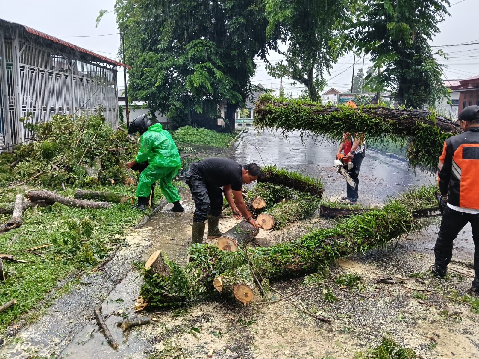 Kopda Nofriadi bersama tim BPBD Kota Pariaman kemudian melakukan pembersihan dan pemotongan batang pohon menggunakan peralatan khusus. Berkat kerja cepat dan sinergi di lapangan, akses jalan dapat dibuka kembali dan dilalui kendaraan seperti biasa.