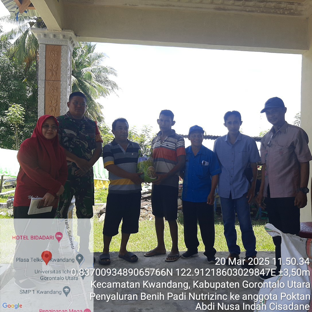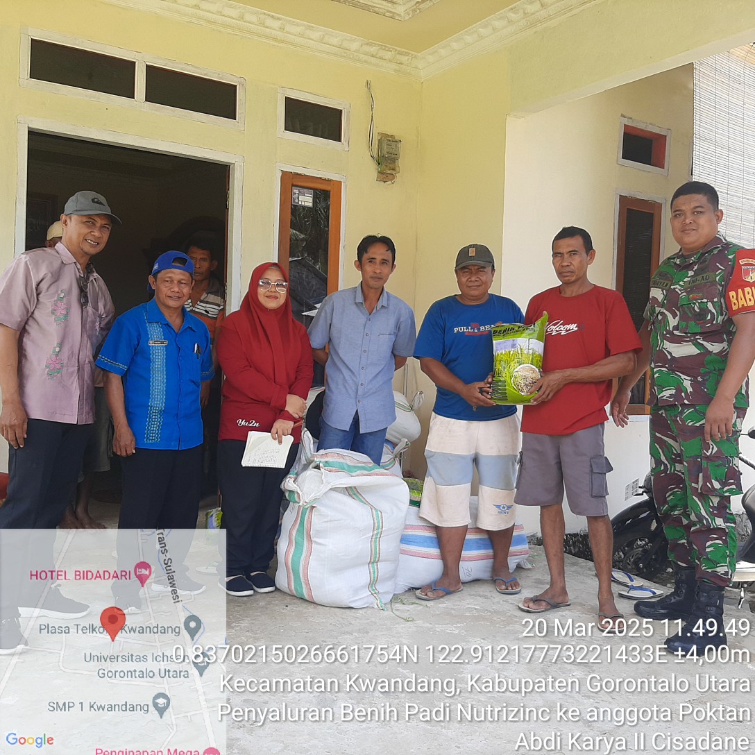 kwandang,kejarberitanews.com-Babinsa Koramil 1314-01/Kwandang, Praka Endry A. Noer, mendampingi kegiatan penyerahan bantuan bibit padi jenis Impago kepada kelompok tani di Desa Cisadane, Kecamatan Kwandang, Kabupaten Gorontalo Utara. Kegiatan ini merupakan bagian dari upaya pemerintah dalam mendukung sektor pertanian dan meningkatkan kesejahteraan petani di daerah tersebut pada Kamis, 20 Maret 2025.