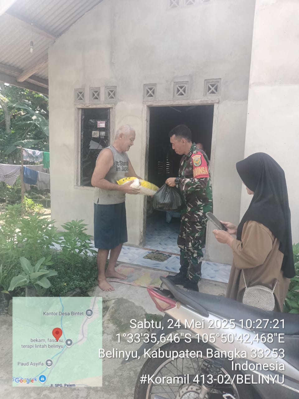 Belinyu,kejarberitanews.com-Sebagai bentuk kepedulian terhadap masyarakat, Babinsa koramil 413-02/Belinyu turun langsung membagikan bantuan berupa sembako kepada warga binaan yang kurang mampu di Desa bintet kecamatan belinyu, Sabtu (24/05/2025)