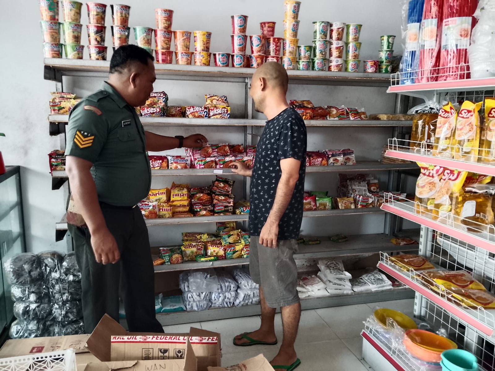 Serka Ali Musthafa turun langsung memantau stabilitas dan ketersediaan harga berbagai jenis sembako di toko Bapak Iwan. Pengecekan ini merupakan bagian dari upaya Babinsa untuk memastikan kebutuhan pokok masyarakat tetap terjangkau dan mencegah penimbunan barang.