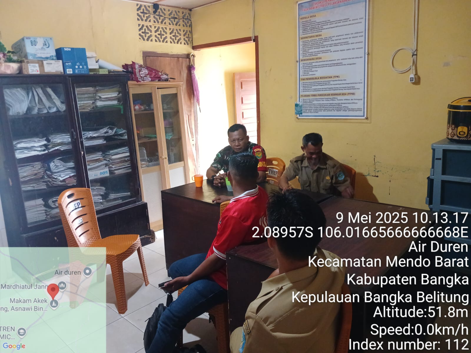 MendoBarat,kejarberitanews.com-Babinsa koramil 413-04/Mendo barat Komsos Dengan Perangkat Desa Bahas tentang keamanan Dan ketertiban di wilayah desa binaan di kantor desa air duren, Jumat (09/05/2025)