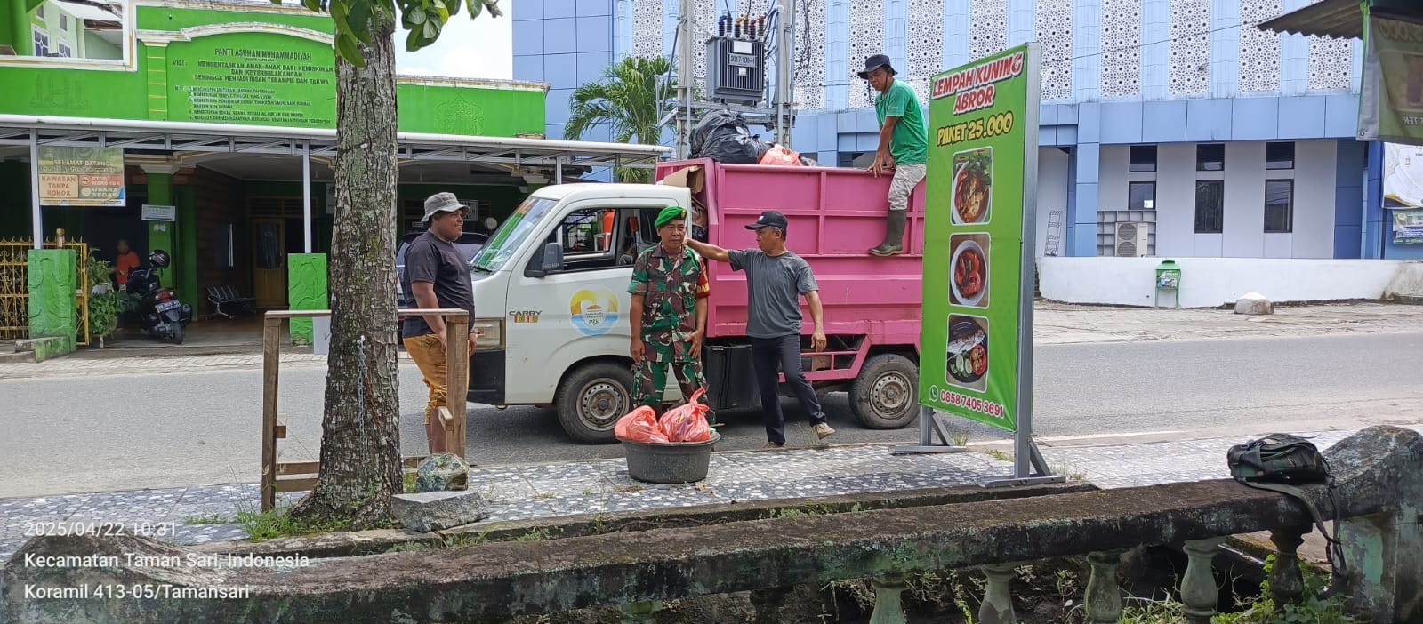 TamanSari,kejarberitanews.com-Jaga Kebersihan Lingkungan, Babinsa Koramil 413-05/Taman sari Bantu Petugas Kebersihan Angkat Sampah yang menumpuk bertempat di kelurahan batin tikal, Selasa (22/04/2025)