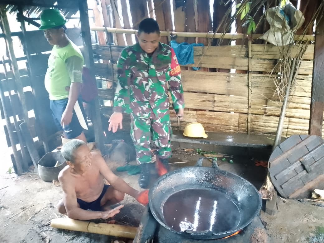 Dengan mengenakan seragam loreng khas TNI, Serda Rinto tampak akrab berbincang dengan para pengrajin yang tengah menjerang nira aren di tungku tradisional. Dalam pertemuan sederhana itu, ia mendengarkan langsung berbagai kendala yang dihadapi warga, mulai dari keterbatasan bahan bakar hingga proses pemasaran hasil produksi.