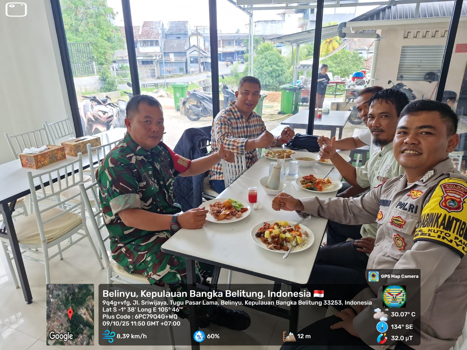 Kegiatan ditutup dengan makan siang bersama, menunjukkan keakraban dan komitmen untuk bersama-sama menjaga keamanan serta mendukung program pembangunan di wilayah Belinyu.