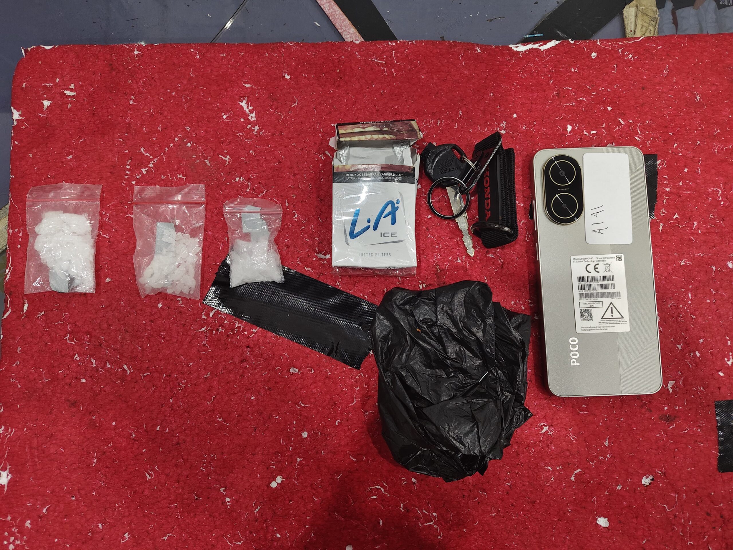 “Dari tangan pelaku kami berhasil mengamankan barang bukti tiga plastik klip berisi kristal putih diduga sabu, satu plastik asoy hitam, satu kotak rokok merek LA Ice, satu ponsel Xiaomi putih, dan satu sepeda motor Honda Beat hitam,” jelasnya.