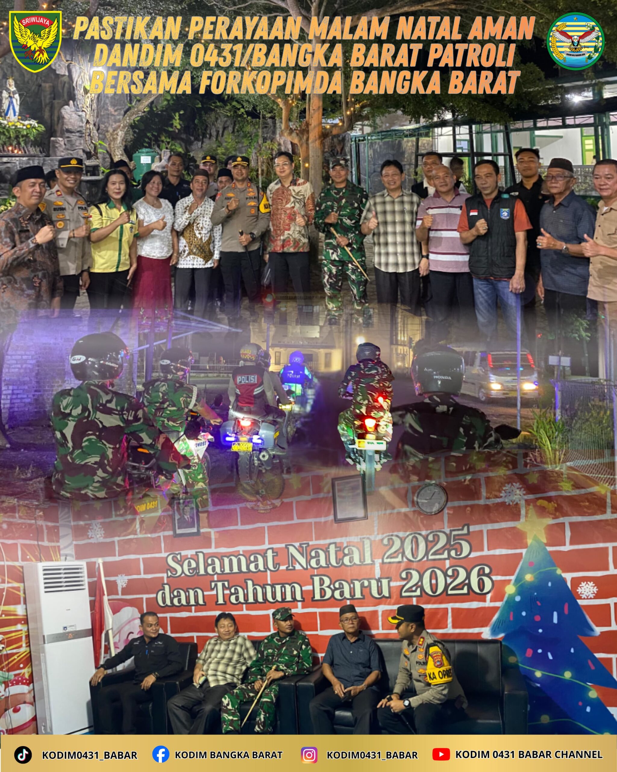 Dalam rangka menjamin keamanan dan kenyamanan masyarakat pada perayaan Misa Malam Natal Tahun 2025, Kodim 0431/Bangka Barat bersama unsur, Polri, pemerintah daerah, serta instansi terkait melaksanakan patroli bersama dan pengamanan terpadu, termasuk pengecekan Pos Pengamanan (Pos PAM) Pelabuhan.