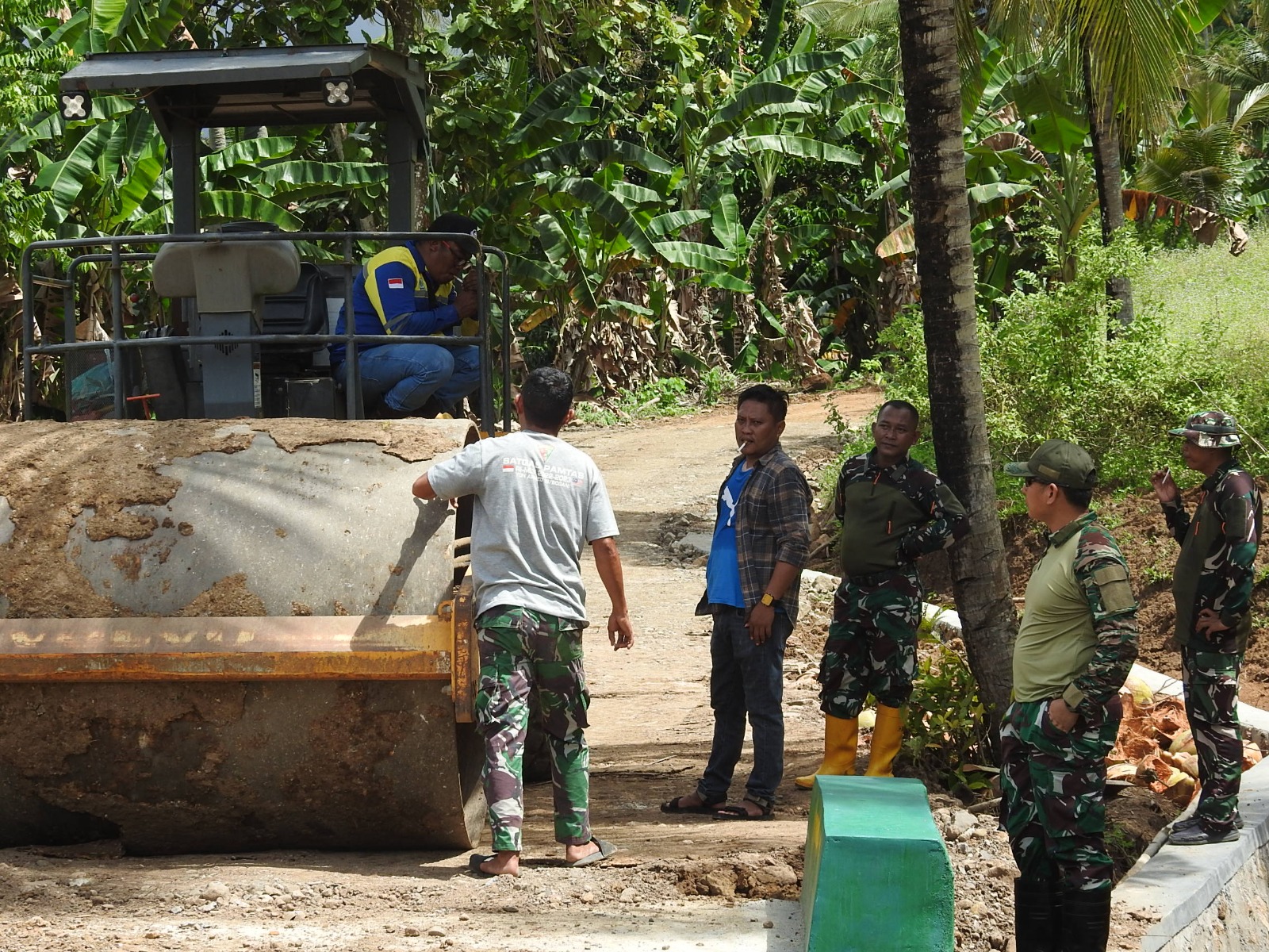 Proses pembangunan dilakukan dengan melibatkan alat berat seperti mesin pemadat tanah (stoom walls), serta gotong-royong bersama masyarakat setempat. Jalan yang dibangun membelah area perkebunan kelapa dan pisang milik warga, memperlihatkan sinergi nyata antara TNI dan masyarakat dalam membangun desa.