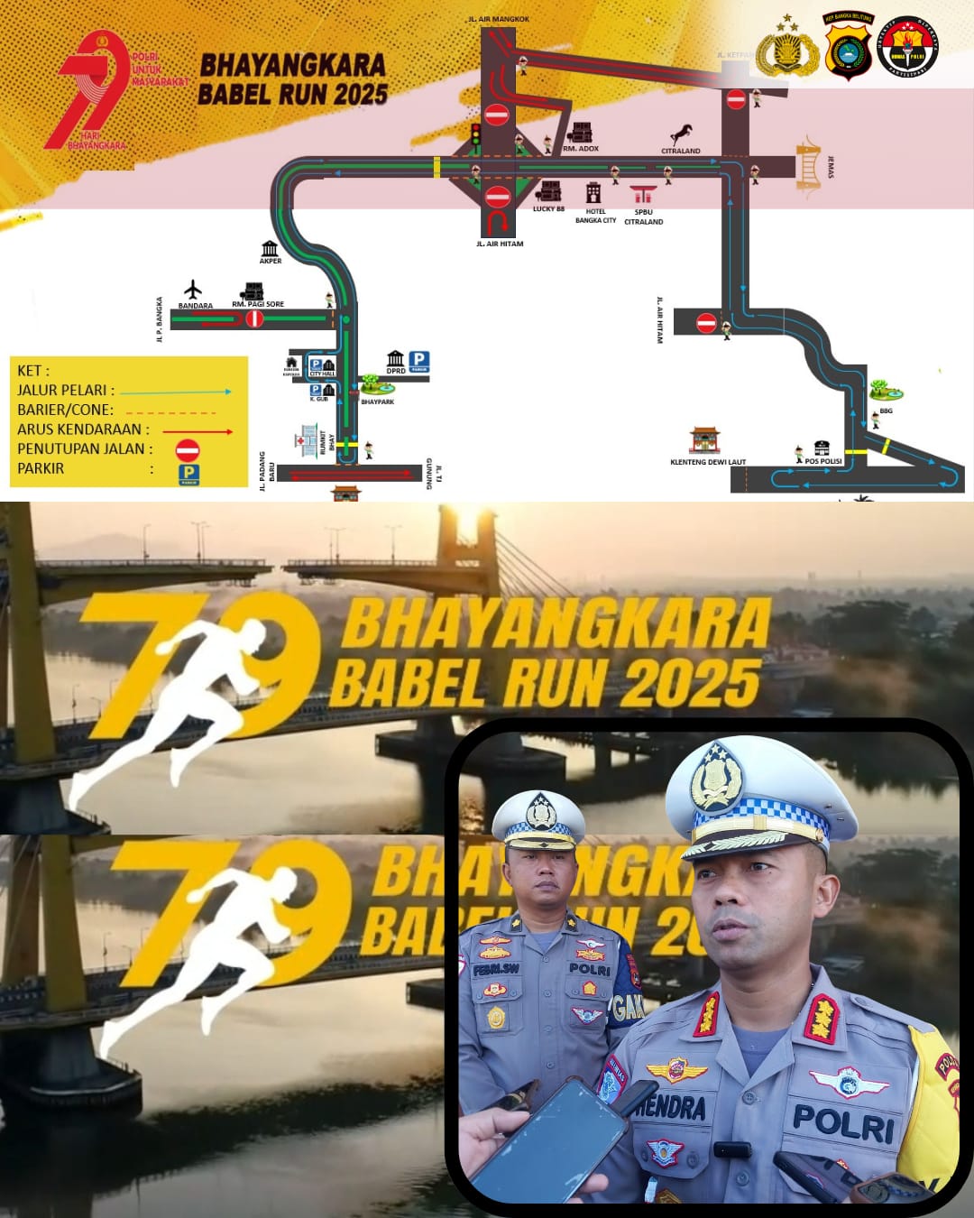 “Sehubungan dengan dilaksanakannya event Bhayangkara Babel Run 2025 dalam rangka HUT Bhayangkara ke 79, kami dari Kepolisian memohon maaf kepada masyarakat untuk arus lalu lintas terganggu selama event ini nantinya berlangsung,”kata Dir Lantas Kombes Pol Hendra Gunawan, Rabu (11/6/25) pagi.
