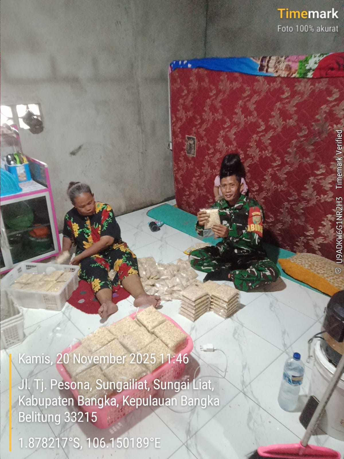 Sungailiat, kejarberita-news.com – Dalam upaya memperkuat kemanunggalan TNI dengan rakyat sekaligus memberikan dukungan terhadap UMKM Serka Nurahman babinsa Koramil 413-01/Sungailiat, komsos di wilayah binaan bertempat di pabrik pembuatan tempe dan tahu milik Bapak Muninggar dan Ibu Sumit di Lingkungan Rambak, Kamis (20/11/2025)