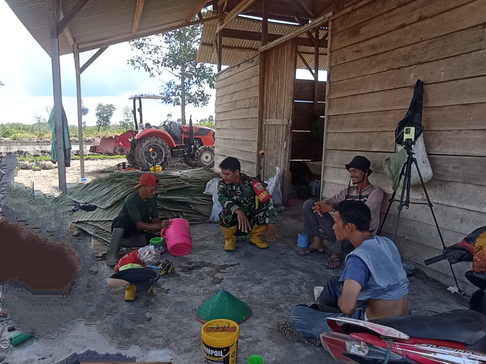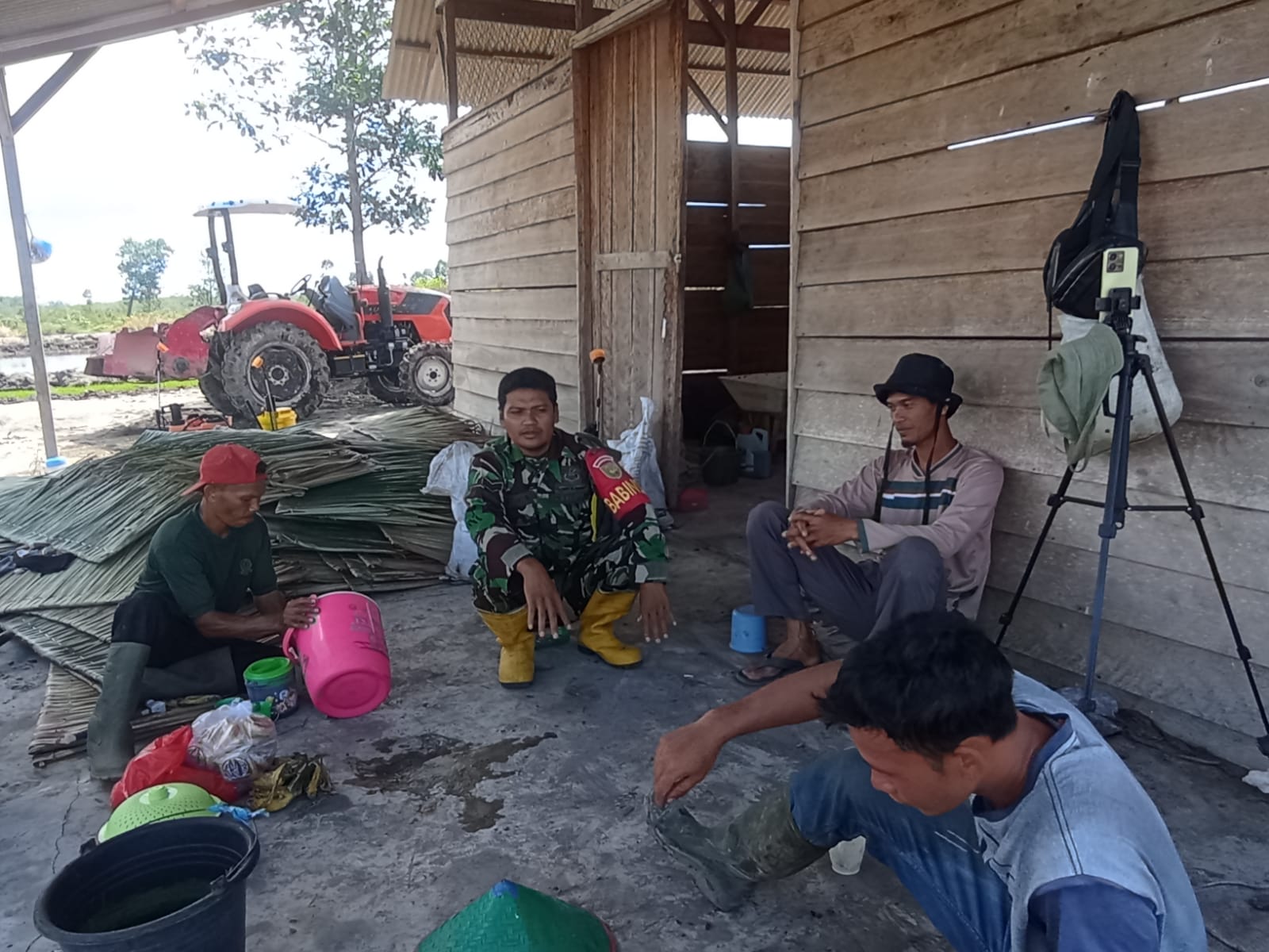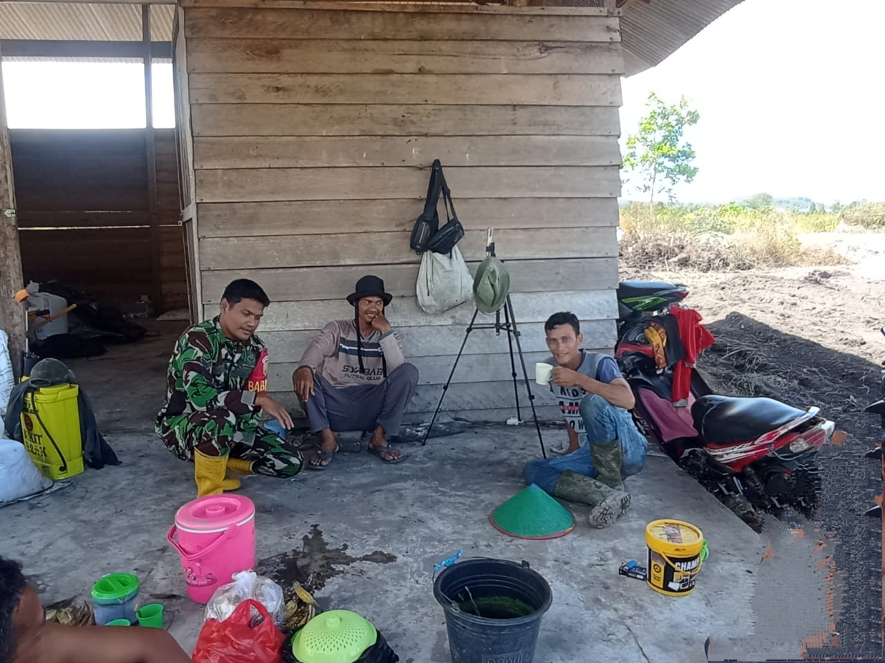 Bangka Barat,kejarberitanews.com-Sertu Tri Sutrisno Babinsa Koramil 431- 02 /Mentok Melaksanakan Komsos dengan warga yang sedang istirahat sehabis mengolah lahan pertanian miliknya Sdr. Narya Desa Bukit Terak Kec.Simpang Teritip Kab.Bangka Barat.Selasa(13/05/2025)