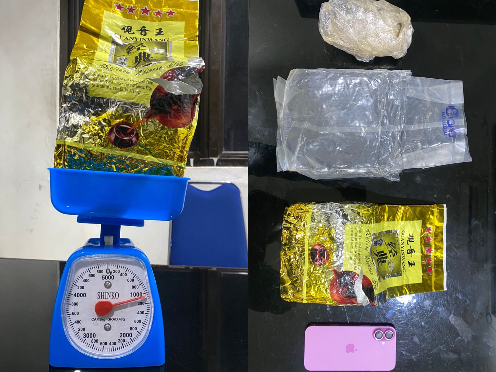 “Saat dilakukan penggeledahan dikontrakannya disaksikan RT setempat, petugas menemukan 1 paket besar plastik warna kuning emas bertuliskan Guanyinwang berisi narkotika jenis sabu yang disimpan pelaku dibawah meja,”terangnya.