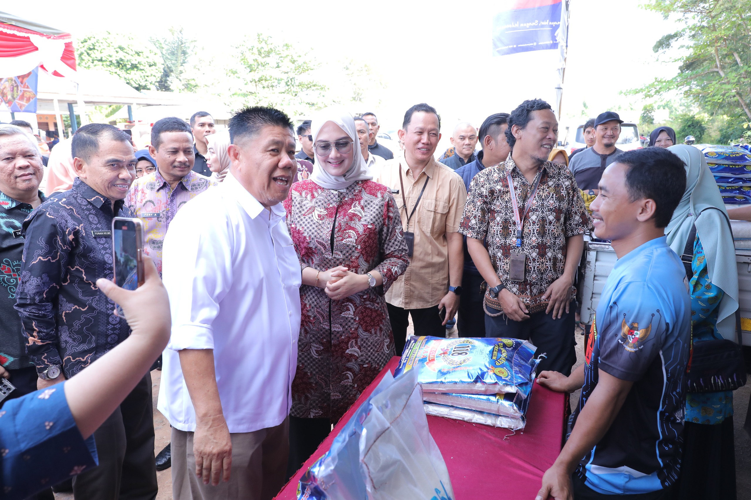 Gubernur Kepulauan Bangka Belitung, Hidayat Arsani bersama Ketua TP PKK Provinsi Babel, Noni Hidayat Arsani, turun langsung meninjau kegiatan pasar murah dan bazar Usaha Mikro Kecil Menengah (UMKM) sekaligus menyerahkan bantuan sembako kepada masyarakat di Terminal Selindung, Pangkalpinang, Kamis (12/3/2026).