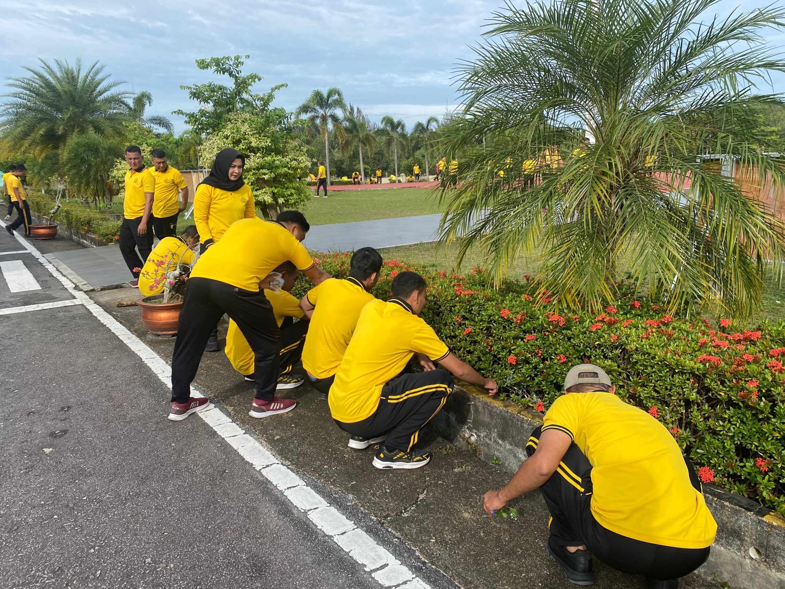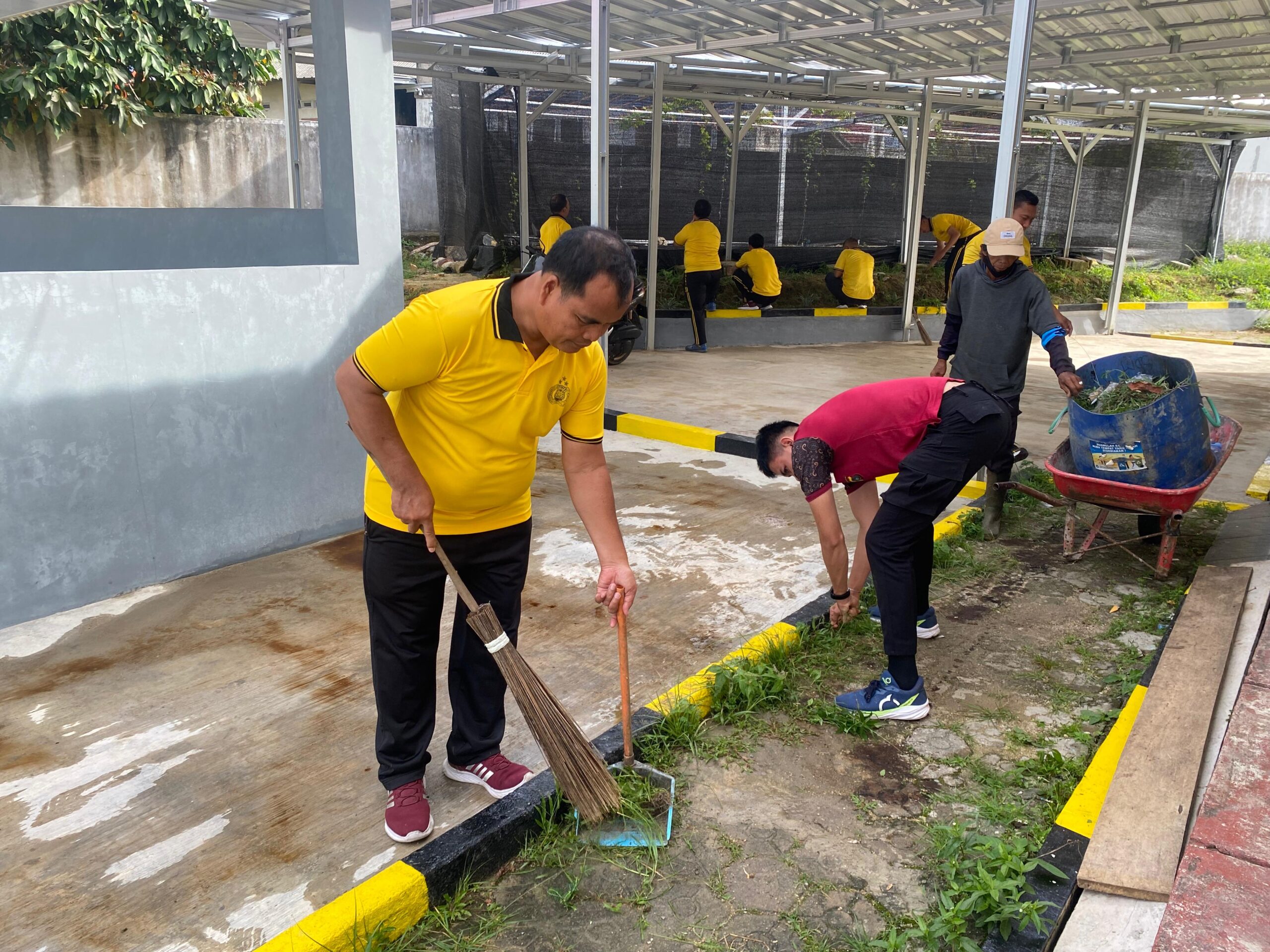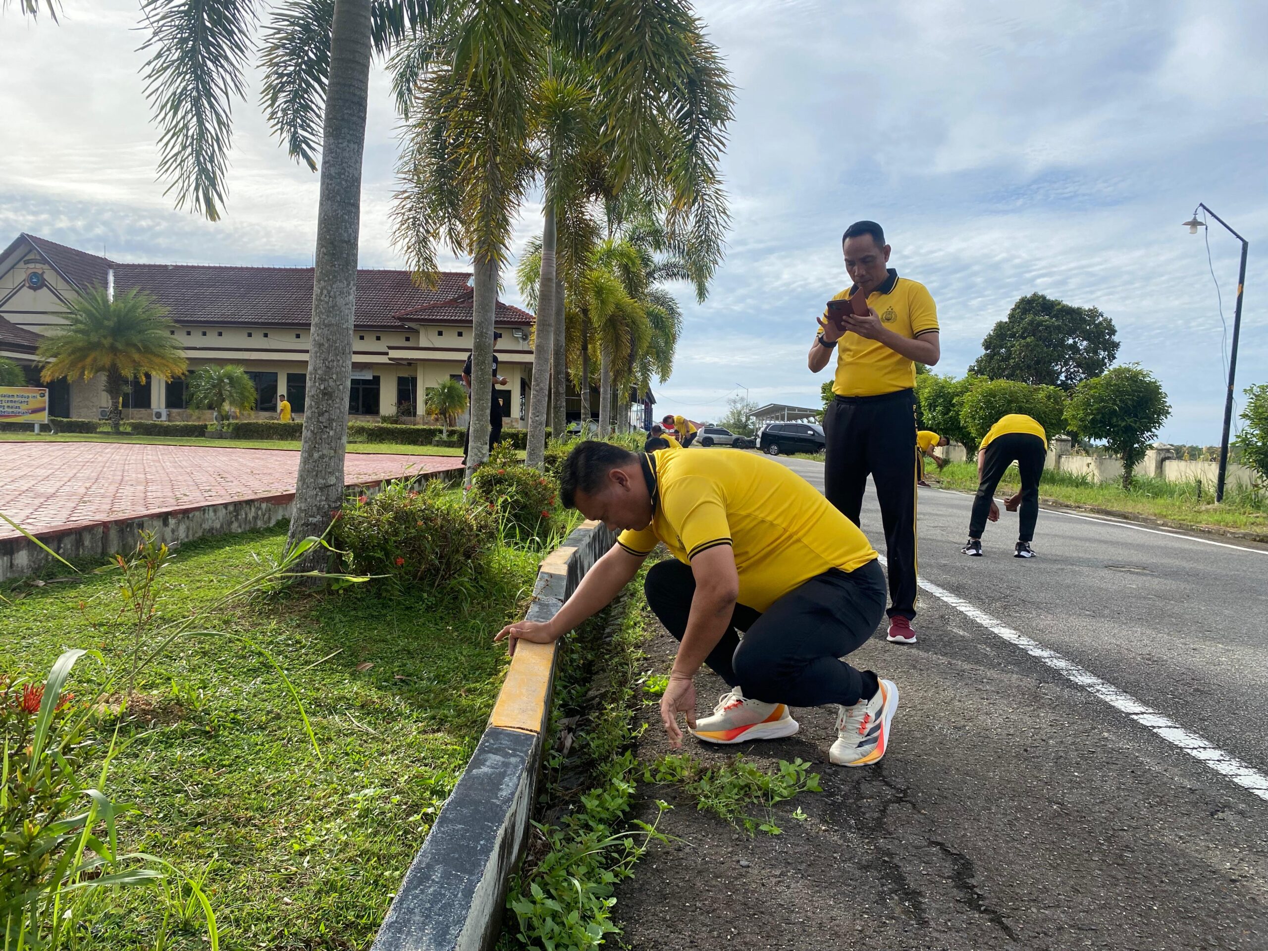 Sejak pagi, personel terlihat membersihkan halaman mako, menata asrama, merapikan taman, hingga menertibkan spanduk atau baliho yang telah kedaluwarsa di sekitar lingkungan kantor kepolisian.