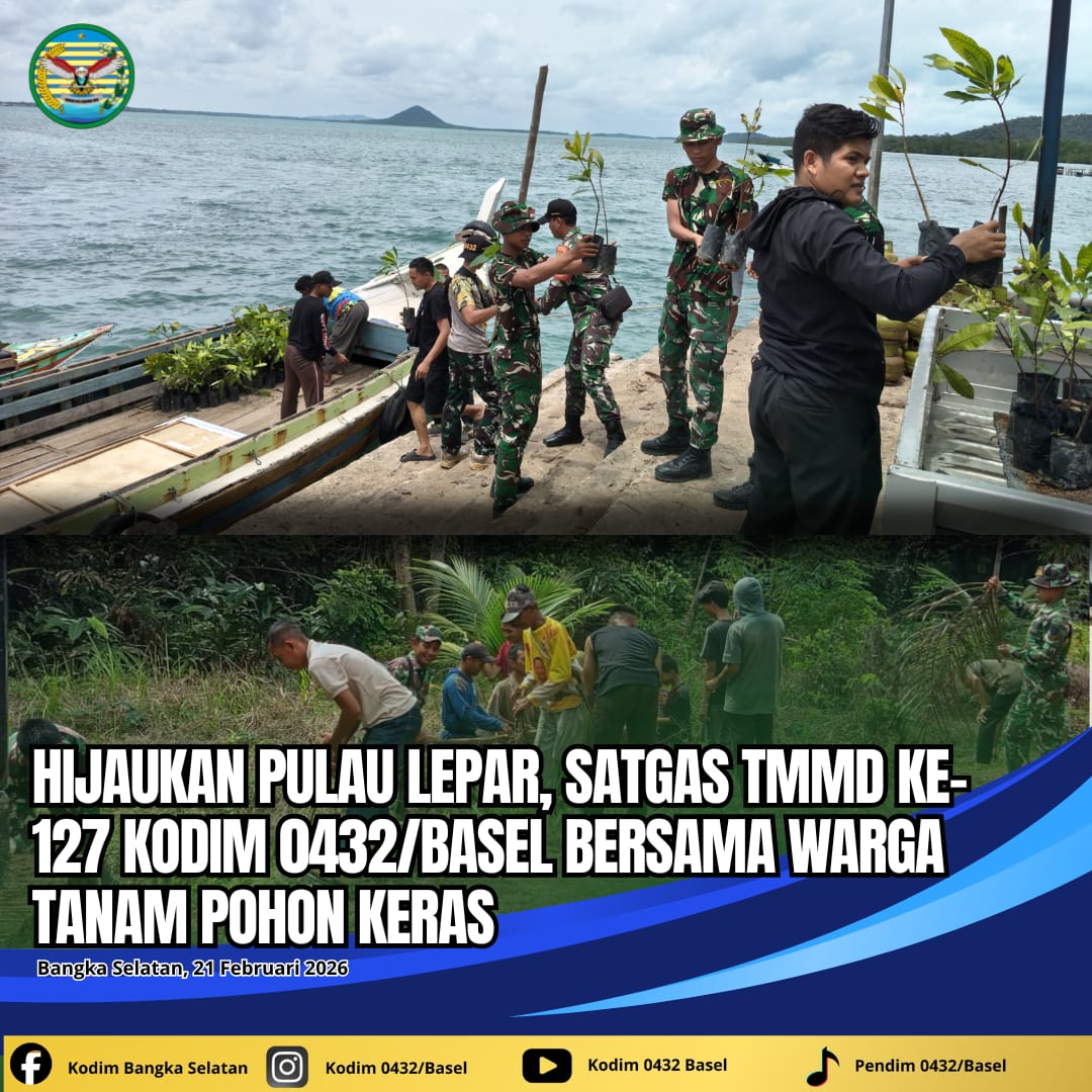 Pulau Lepar, kejarberitanews.com – JARAK TIDAK JADI HALANGAN Dalam rangka mendukung pelestarian lingkungan hidup sekaligus menyukseskan program TNI Manunggal Membangun Desa (TMMD) Ke-127 Tahun Anggaran 2026, Satgas TMMD Kodim 0432/Bangka Selatan bersama masyarakat melaksanakan kegiatan penanaman pohon sebanyak 300 Batang di Desa Penutuk, Kecamatan Pulau Lepar, Kabupaten Bangka Selatan, Sabtu (21/02/2026).
