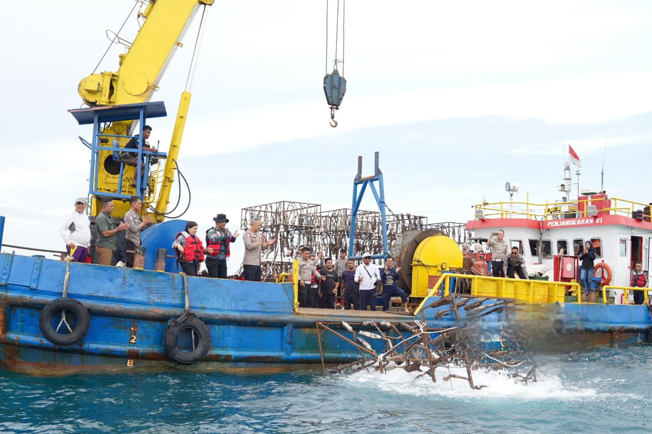 Dari pantauan, satu persatu rumpon itu diturunkan dan dilepaskan ke laut di perairan Rebo menggunakan kapal crane yang telah disiapkan.