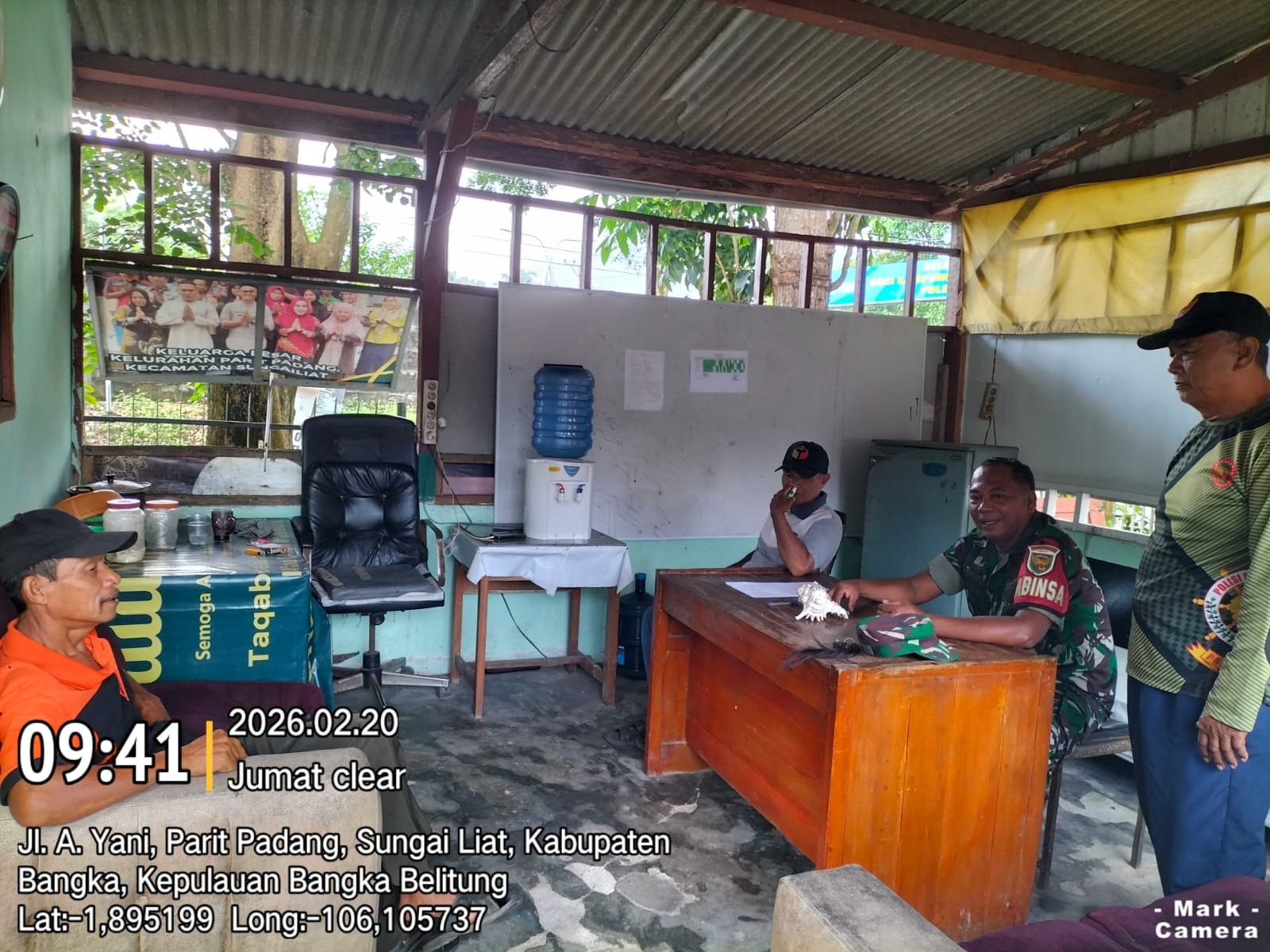 Sungailiat, kejarberitanews.com – Babinsa Koramil 413-01/Sungailiat, Serka Mukra, terus aktif melaksanakan kegiatan Komsos di wilayah binaannya. Kali ini, koordinasi dilakukan bersama Kepala Lingkungan dan anggota Linmas di Kantor Lurah Parit Padang, Kecamatan Sungailiat, Jumat (20/02/2026).