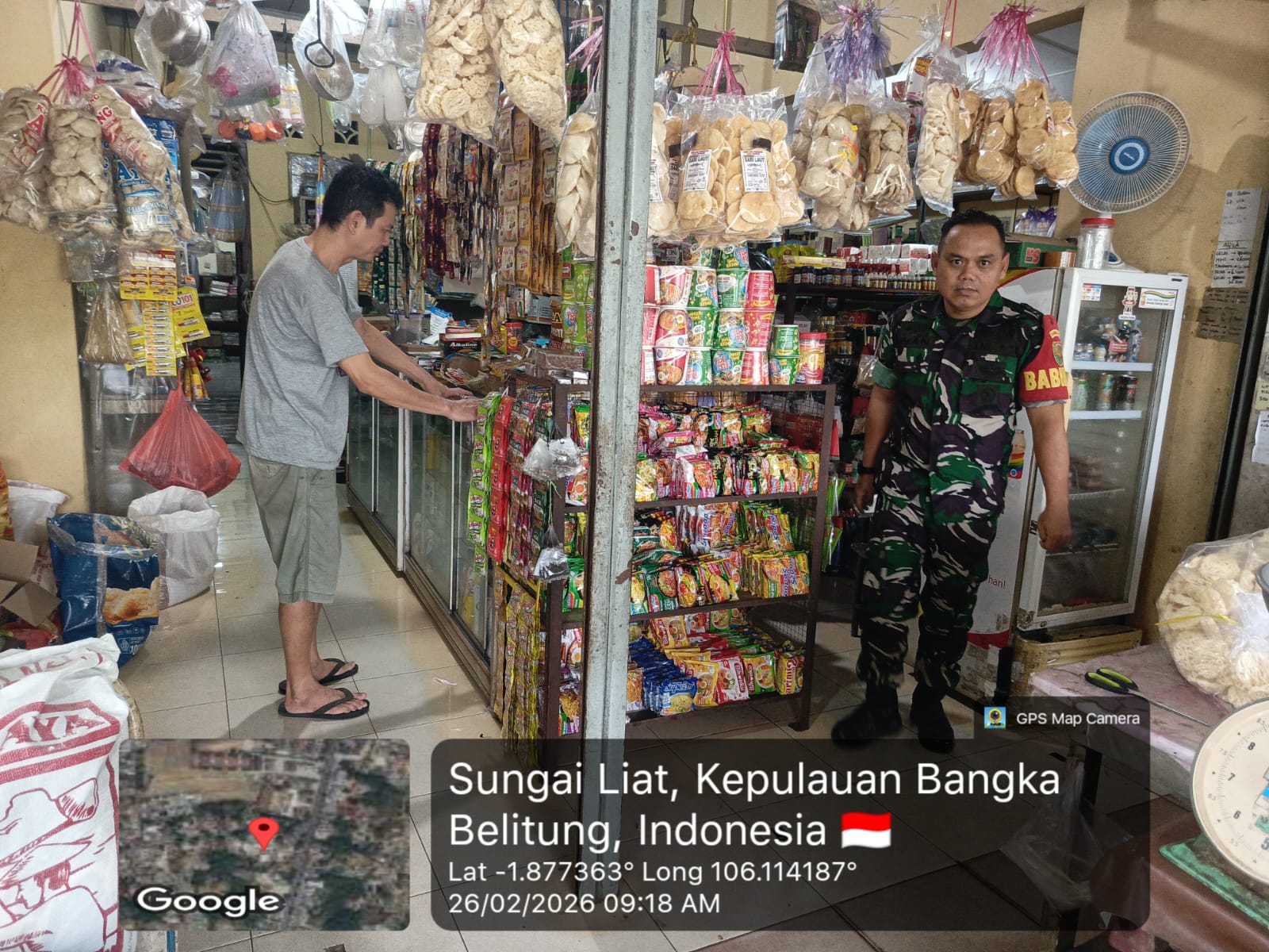 Serda Iwan W, Babinsa Koramil 0413-01/Sungai Liat, melaksanakan kegiatan komsos sekaligus memantau harga sembako di Toko Ibu Devi, Desa Rebo, Kecamatan Sungai Liat, Kamis (26/02/2026).