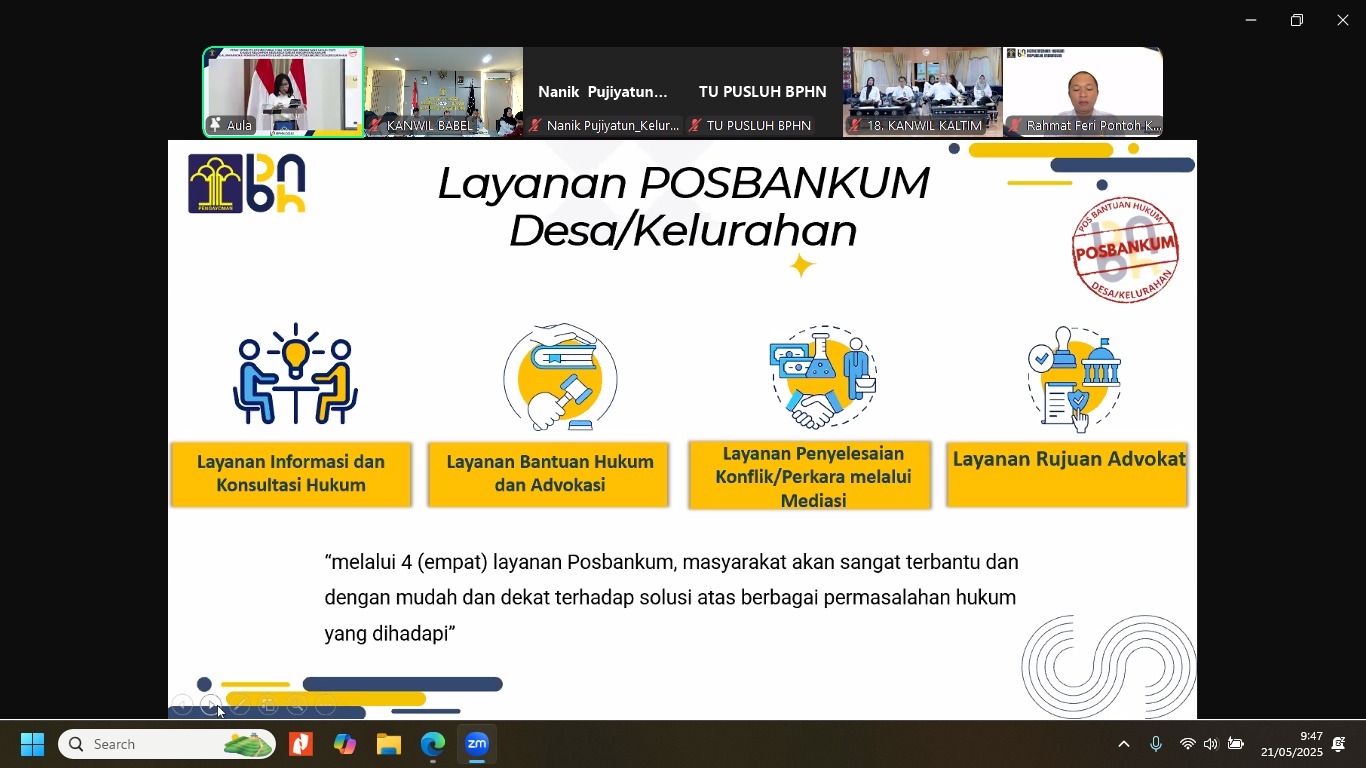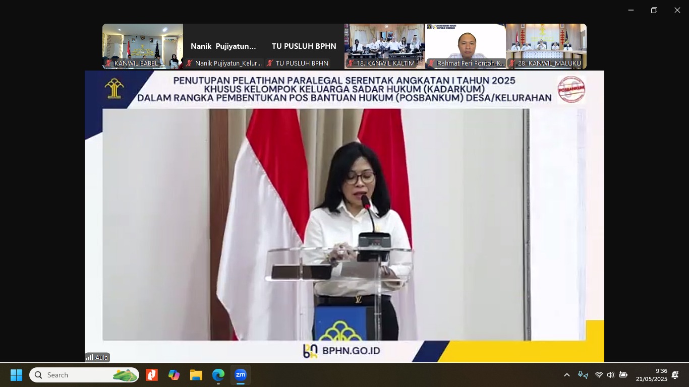 Pangkal Pinang,kejarberitanews.com-22 Mei 2025 – Plt. Kepala Kantor Wilayah Kemenkum Kepulauan Bangka Belitung, Harun Sulianto,ikuti penutupan Pelatihan Paralegal Serentak (Parletak) Angkatan I Tahun 2025 secara virtual di Ruang Rapat Lantai II Kantor Wilayah. Kegiatan ini diselenggarakan oleh Badan Pembinaan Hukum Nasional (BPHN) dan dikhususkan bagi kelompok Keluarga Sadar Hukum (KADARKUM) dalam rangka pembentukan Pos Bantuan Hukum (Posbakum) di desa dan kelurahan.