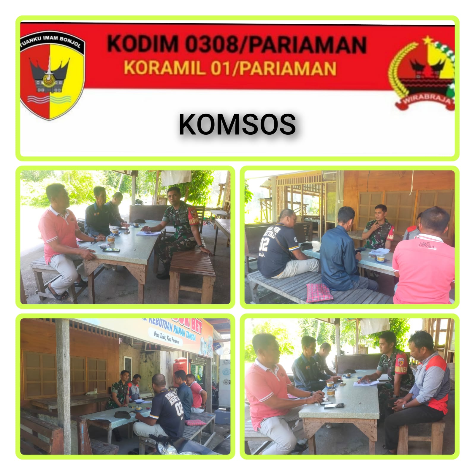 “Sertu Agus syafni mengatakan bahwa dengan Komsos pihaknya juga dapat mengetahui perkembangan situasi di wilayah Desa binaan dan dapat melakukan upaya deteksi dini dan cegah dini, sehingga apabila ada hal-hal negatif yang berkembang bisa cepat diselesaikan,” katanya.
