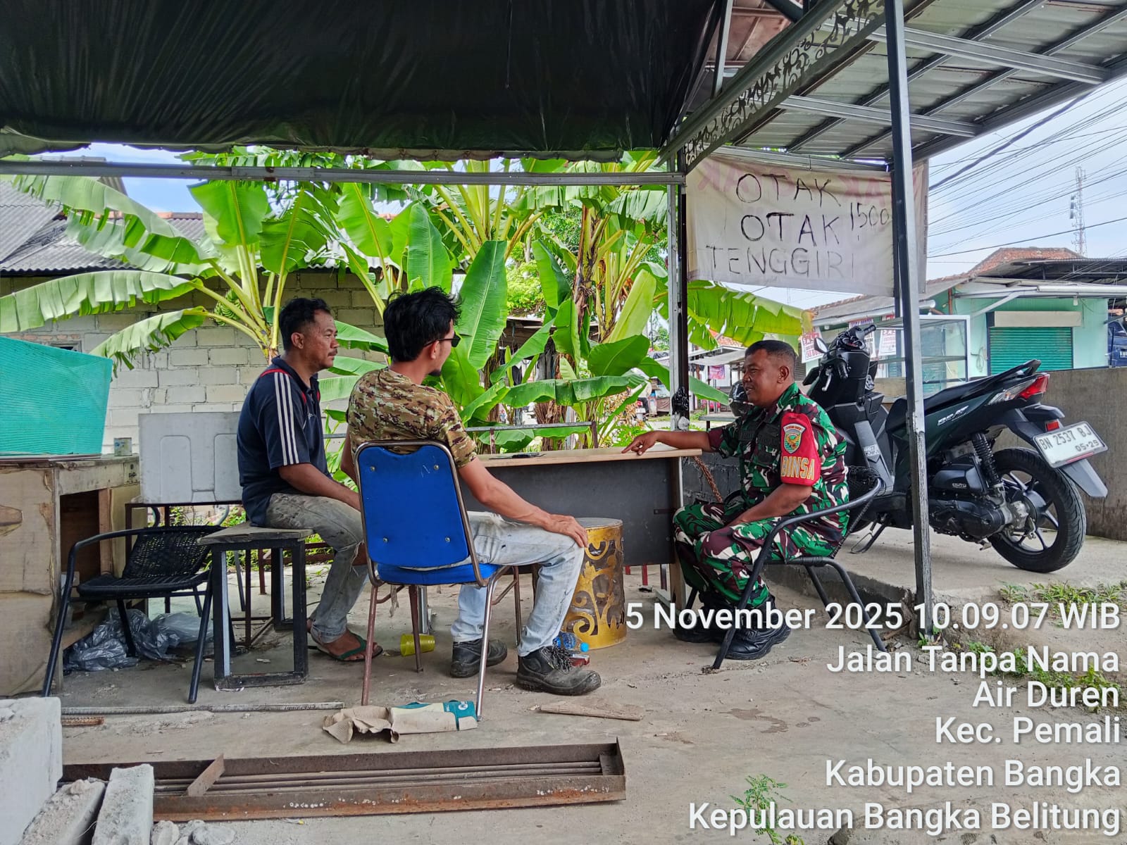 Air Duren, kejarberita-news.com – Dalam upaya menjaga komunikasi dua arah dan memelihara hubungan baik dengan warga binaan, Sertu Yulianto, Babinsa Kelurahan Air Duren, Koramil 413-01/Sungailiat melaksanakan Komsos dengan pelaku usaha setempat, Rabu (05/11/2025)
