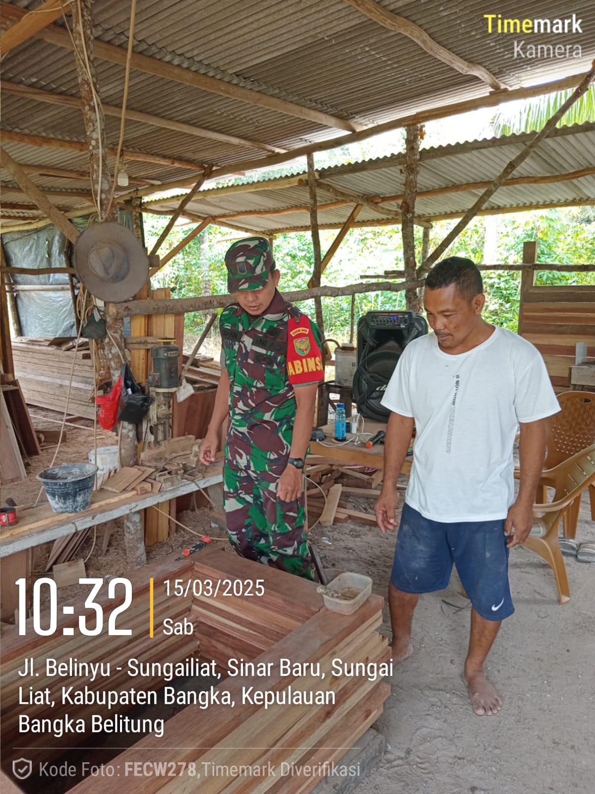 Jalin Silaturahmi Babinsa Koramil 413-01/Sungailiat Komsos Bersama Warga Pembuat Kusen bertempat di kelurahan sinar baru, Sabtu (15/03/2025)