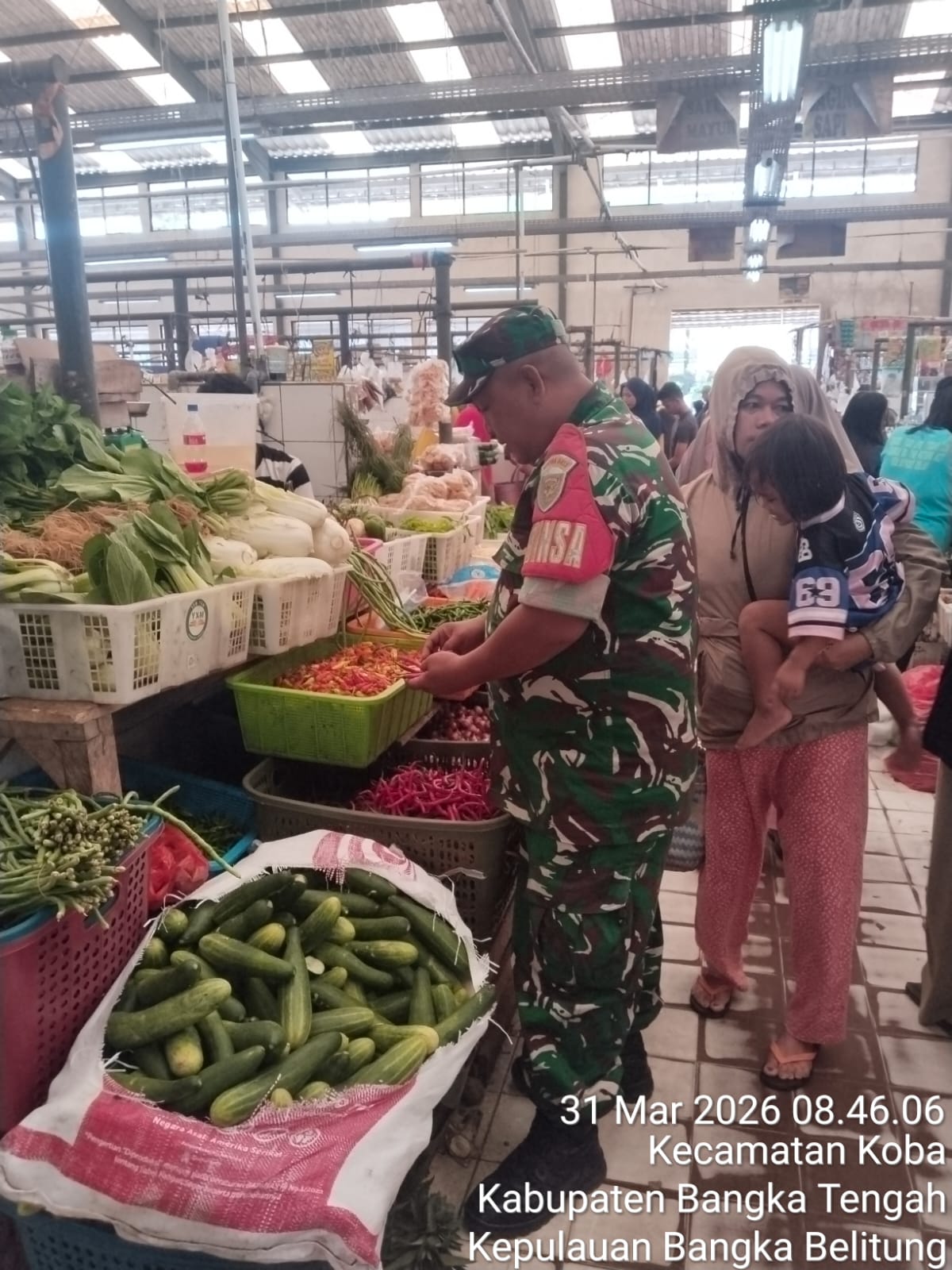 Koba, kejarberitanews.com – Guna memastikan ketersediaan stok dan stabilitas harga kebutuhan pokok di wilayah binaan, Babinsa Koramil 0413-07/Koba, Serka Priyadi, melakukan peninjauan langsung di Pasar Raya Modern Koba, Kelurahan Berok, Kabupaten Bangka Tengah, Selasa (31/03/2026).
