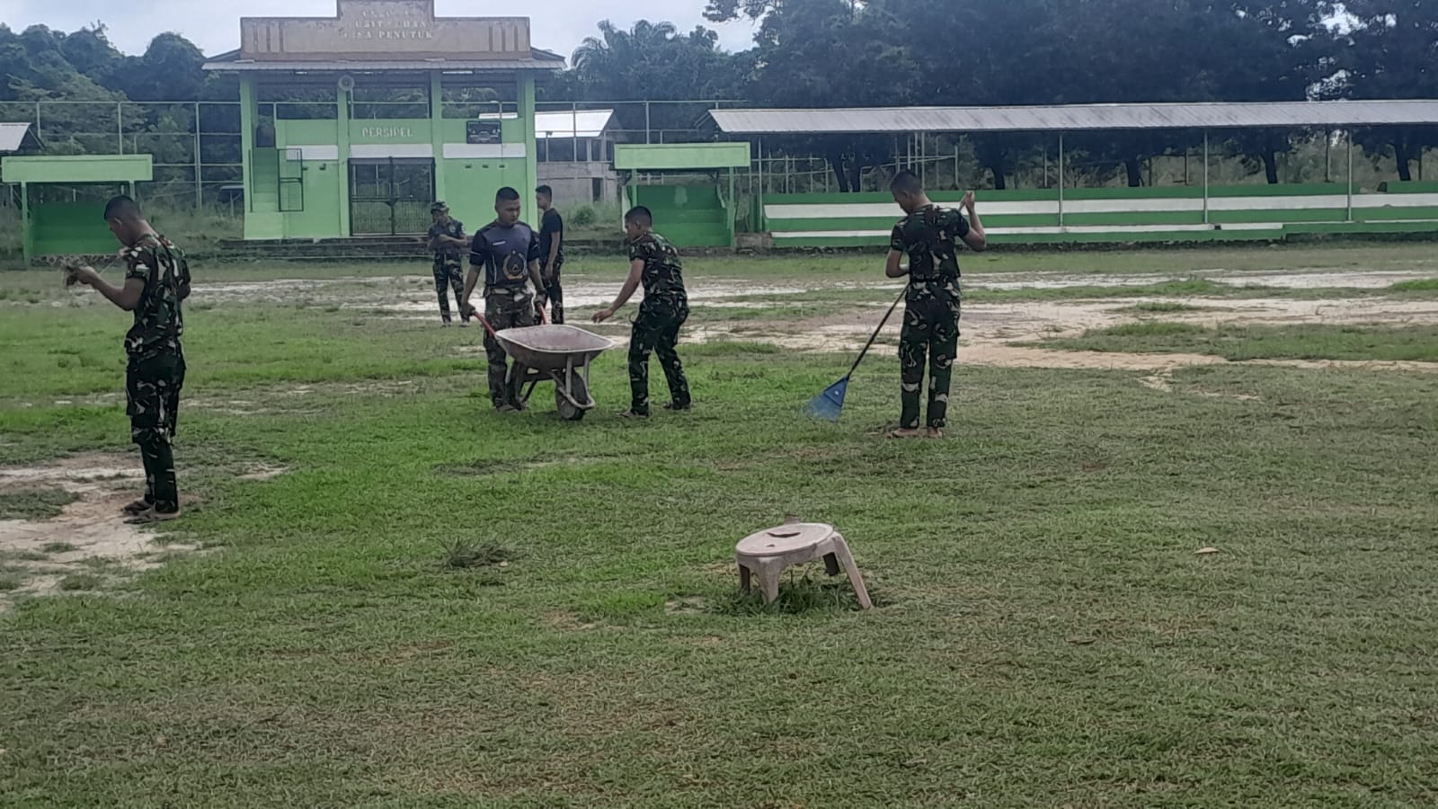 Kegiatan ini meliputi pemotongan rumput yang sudah tinggi, pengangkutan sampah, hingga perataan tanah di area sekitar lapangan guna memastikan kenyamanan dan kelancaran prosesi upacara nantinya. Sinergi antara prajurit TNI dan warga terlihat jelas dalam gotong royong ini, yang menjadi cerminan semangat kemanunggalan TNI dengan rakyat.