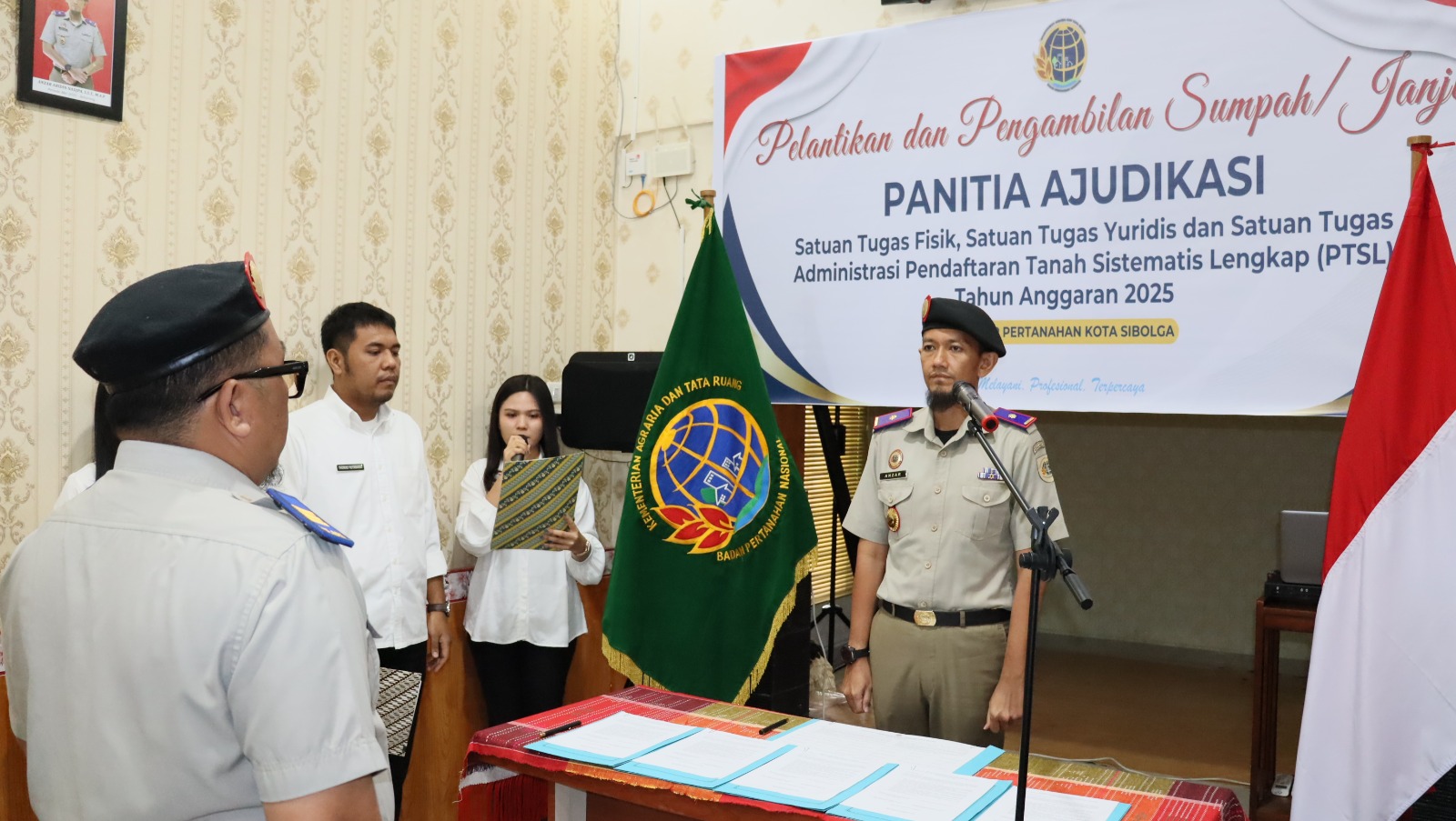 Sibolga, kejarberita-news.com – Kantor Pertanahan Kota Sibolga kembali melaksanakan kegiatan Pelantikan dan Pengambilan Sumpah/Janji Panitia Ajudikasi Satuan Tugas Fisik, Satuan Tugas Yuridis dan Satuan Tugas Administrasi Pendaftaran Tanah Sistematis Lengkap (PTSL) Tahun Anggaran 2025, yang berlangsung dengan khidmat di aula kantor pada hari Rabu, 12 November 2025.