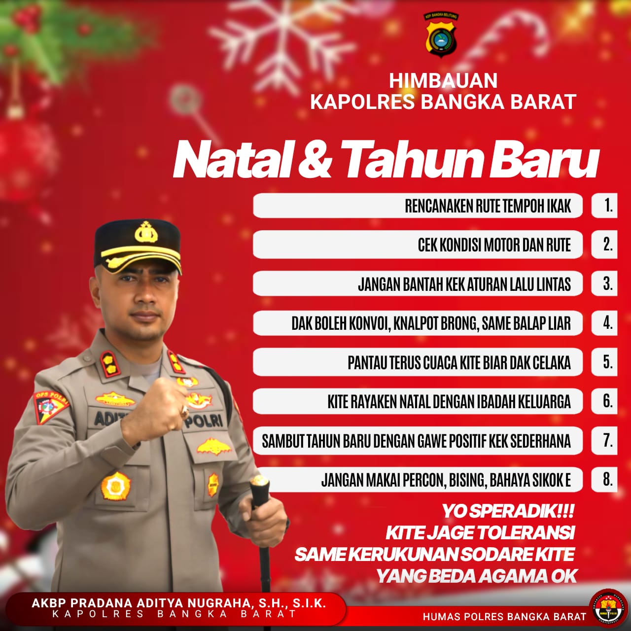 Bangka Barat, kejarberita-news.com – Kapolres Bangka Barat mengimbau seluruh masyarakat untuk bersama-sama menjaga keamanan, ketertiban, serta nilai toleransi selama pelaksanaan Operasi Lilin Menumbing Nataru 2025, khususnya dalam rangka perayaan Natal 2025 dan Tahun Baru 2026 di wilayah Kabupaten Bangka Barat.