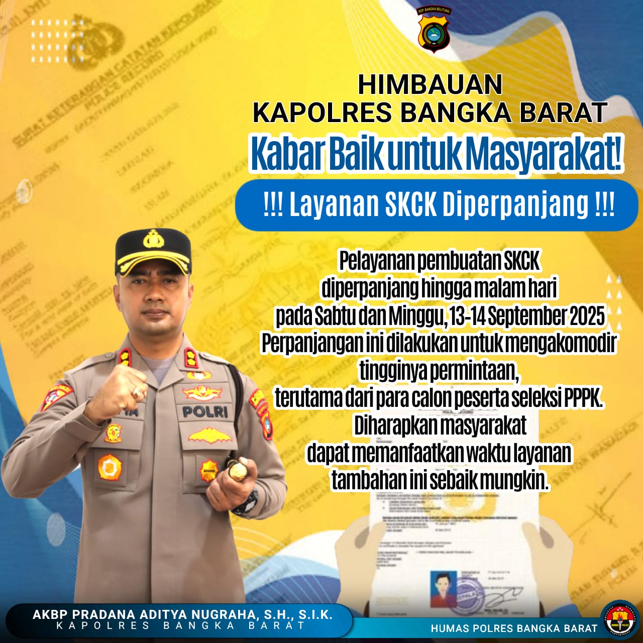 Bangka Barat, kejarberita-news.com– Kapolres Bangka Barat AKBP Pradana Aditya Nugraha, S.H., S.I.K. mengumumkan bahwa layanan penerbitan Surat Keterangan Catatan Kepolisian (SKCK) akan tetap dibuka pada akhir pekan, yakni Sabtu dan Minggu, 13 hingga 14 September 2025, dengan waktu pelayanan diperpanjang hingga malam hari.