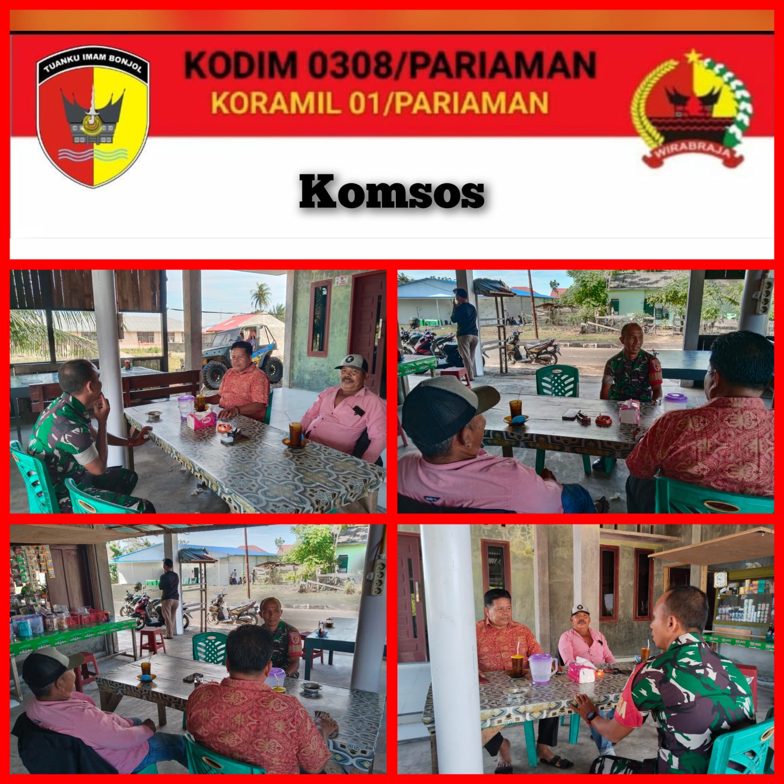 Seperti yang dilakukan oleh Personel Babinsa Koramil 01/Sertu Wendra Perdana melaksanakan kegiatan Komunikasi Sosial (Komsos) bersama dengan mitra karib dalam rangka guna menjalin dan mempererat hubungan silaturahmi yang baik.