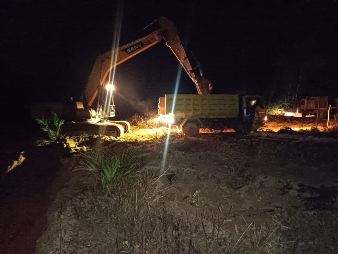 Guna memastikan seluruh target fisik selesai tepat waktu, personel Satgas bersama warga setempat melaksanakan kerja lembur hingga malam hari pada proyek pembangunan infrastruktur jalan.