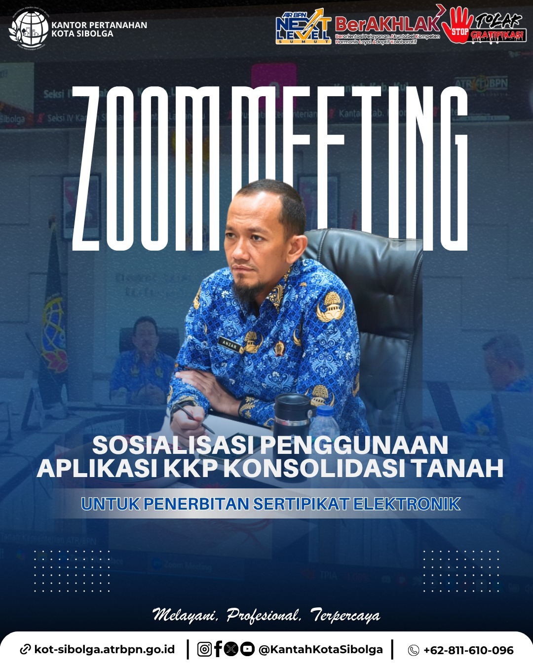 Kepala Kantor Pertanahan Kota Sibolga, Bapak Anzar Abidin Nadjpa, beserta jajaran mengikuti kegiatan Zoom Meeting Sosialisasi Penggunaan Aplikasi KKP Konsolidasi Tanah untuk Penerbitan Sertipikat Elektronik pada, Selasa [17-06-2025], yang diselenggarakan oleh Direktorat Jenderal Pengadaan Tanah dan Pengembangan Pertanahan.