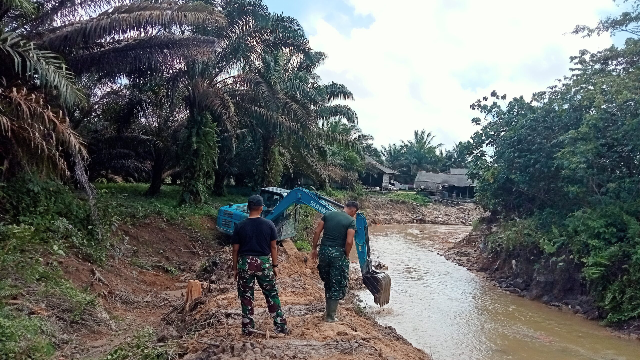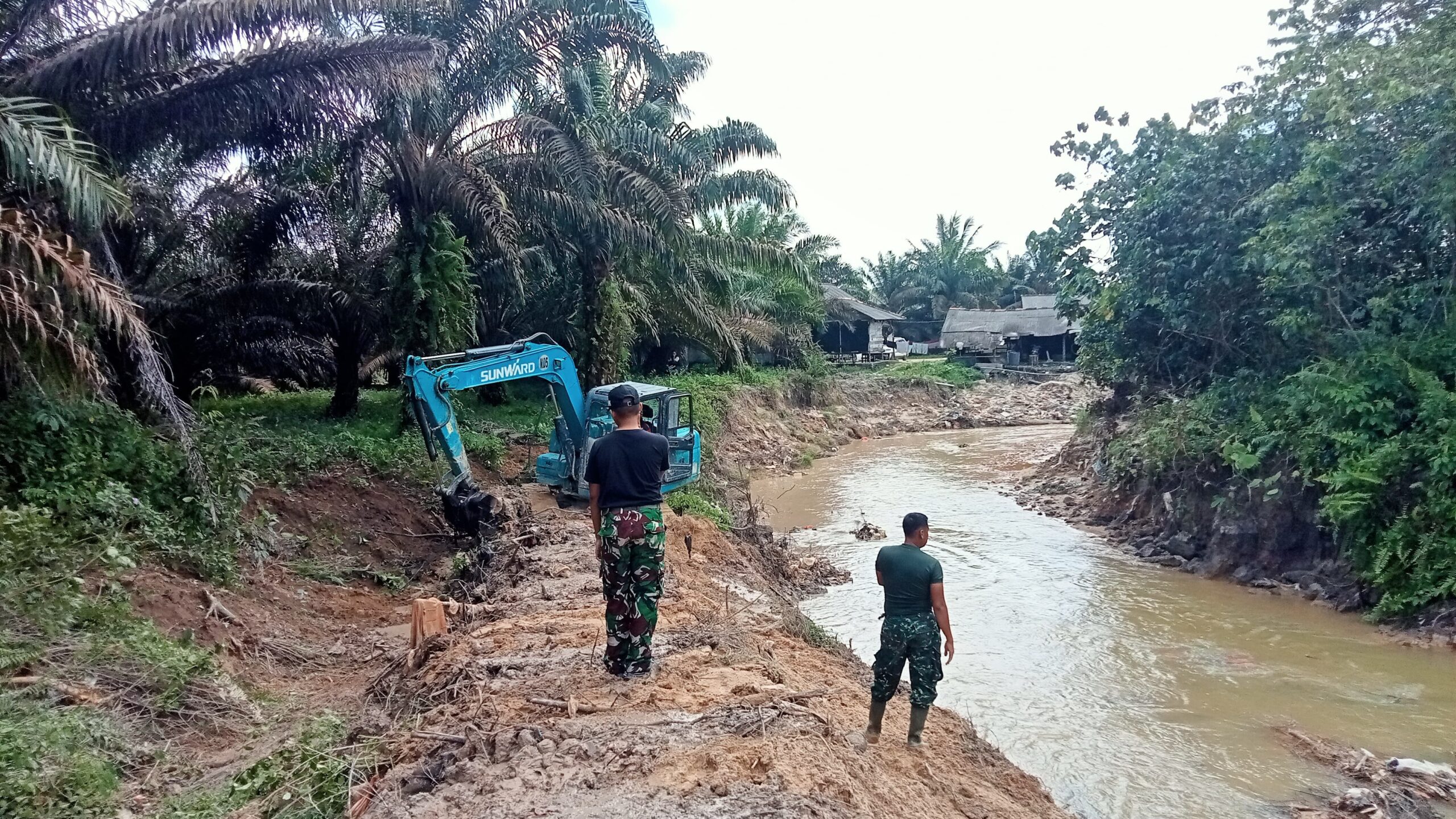 Tidak mengurangi Rasa semangat Personil Kodim 0431/Bangka Barat Tetap mengerjakan Pembuatan Talud dan normalisasi Aliran Sungai yang sering terjadi nya banjir dan longsor di musim hujan yang akan datang pekerjaan yang di lanjutkan pengerukan aliran sungai menggunakan alat excavator.