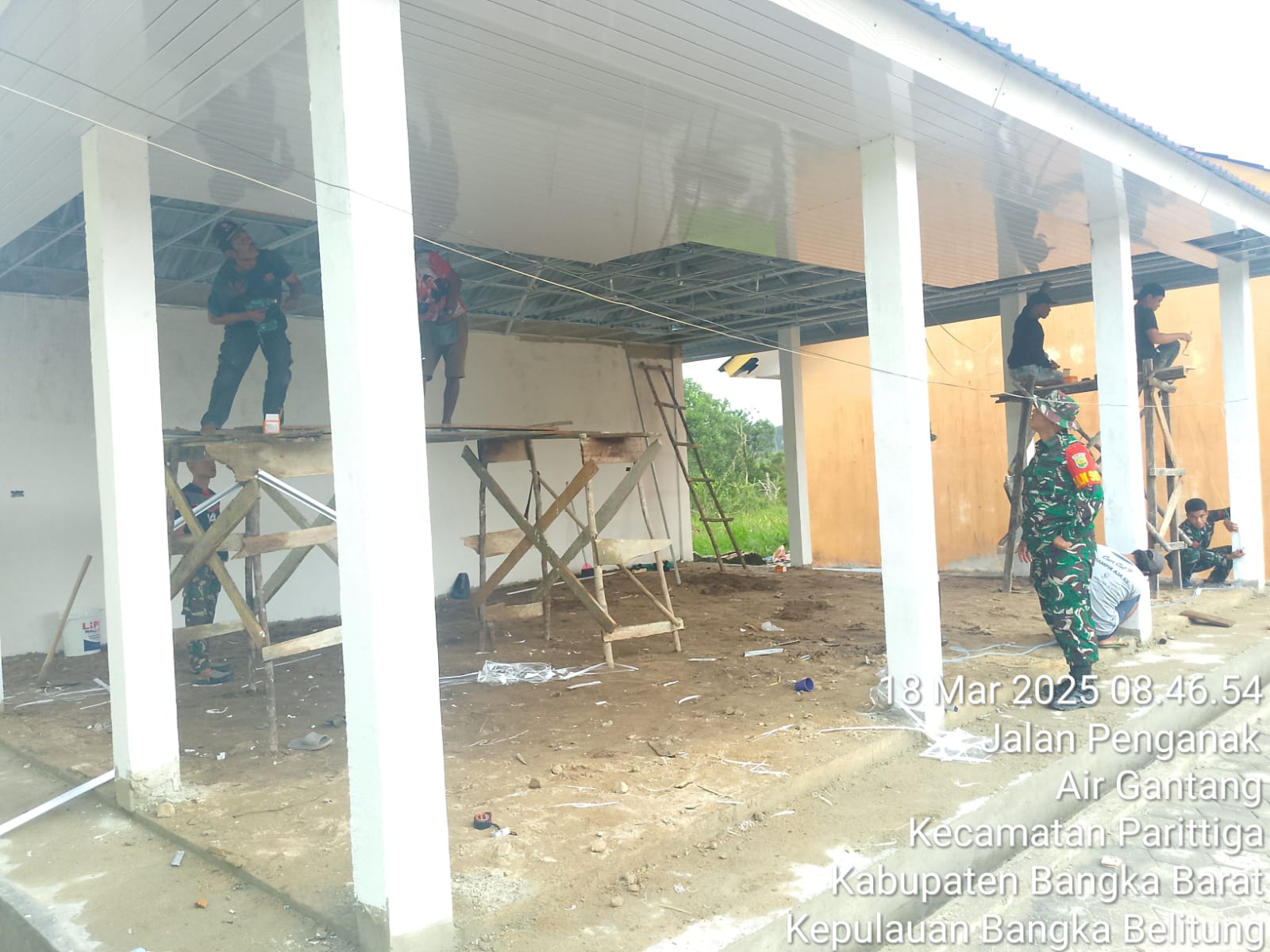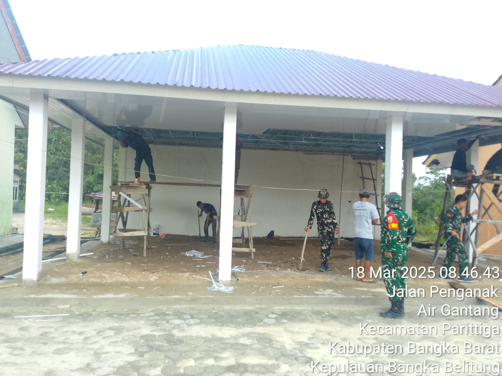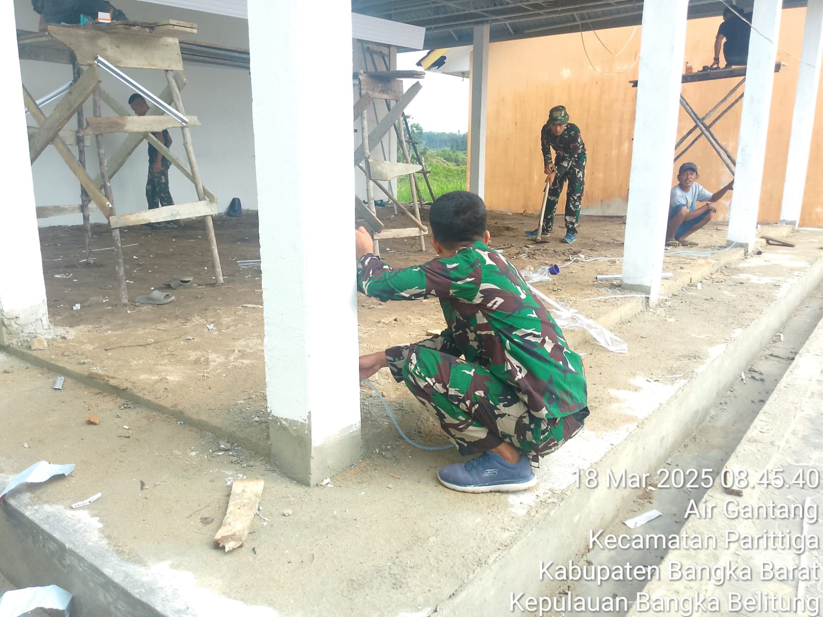 TMMD KE – 123 Kodim 0431/Bangka Barat percepat pembangunan dan Tetap semangat juang Bekerja Anggota Yonif 147/KGJ 9 Orang, Anggota Yonzipur 2 /SG 6 Orang Tukang Sipil 2 Orang Pekerjaan yang di kerjakan Pemasangan batu pondasi dan perakitan besi cor,pemasangan besi cor, selop mall, pemasangan batako, Melaster dinding, pemasangan Kaki-kaki Atap Aula Type 8×6