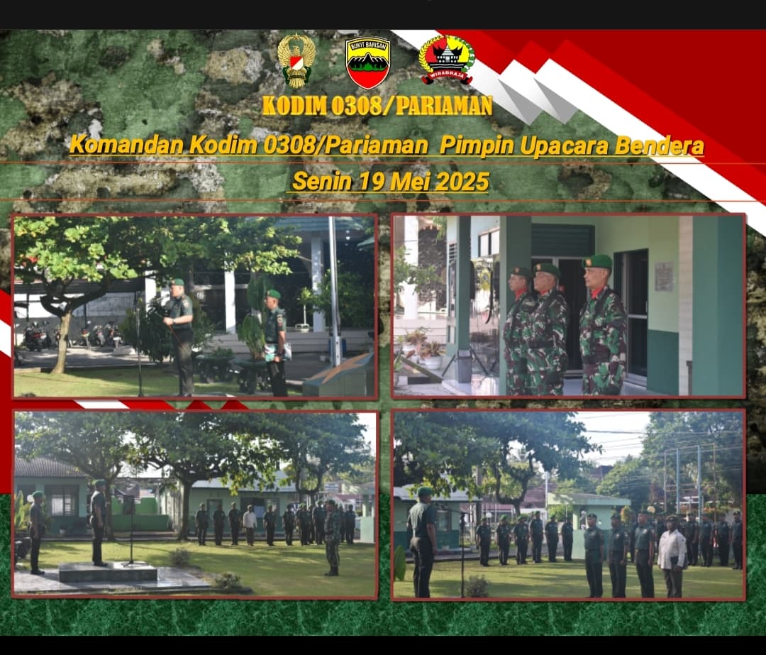PARIAMAN,kejarberitanews.com-Komandan Kodim 0308/Pariaman Letkol Czi Nur Rahmat Khaeroni, menjadi Irup pada Upacara Bendera Tanggal 19 Mei 2025 Bertindak Selaku komandan Upacara Kapten Czi Delri Putra di Lapangan upacara Makodim 0308/Pariaman, Jln. Soekarno Hatta, Desa Toboh Palabah, Pariaman Selatan, Kota Pariaman, Sumatera Barat, Senin (19/05/2025).