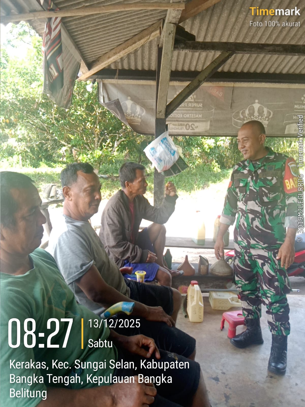 Bangka, kejarberita-news.com – Dalam upaya menjaga keamanan wilayah dan kesiapsiagaan bencana, Kopka Sujarwo, Babinsa Desa Kerakas Koramil 413-08/Sungai Selan, memanfaatkan momen santai untuk menjalin keakraban sekaligus menyampaikan pesan penting kepada warga binaannya, Sabtu (13/12/2025)