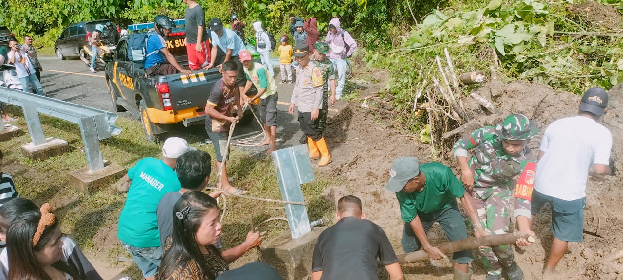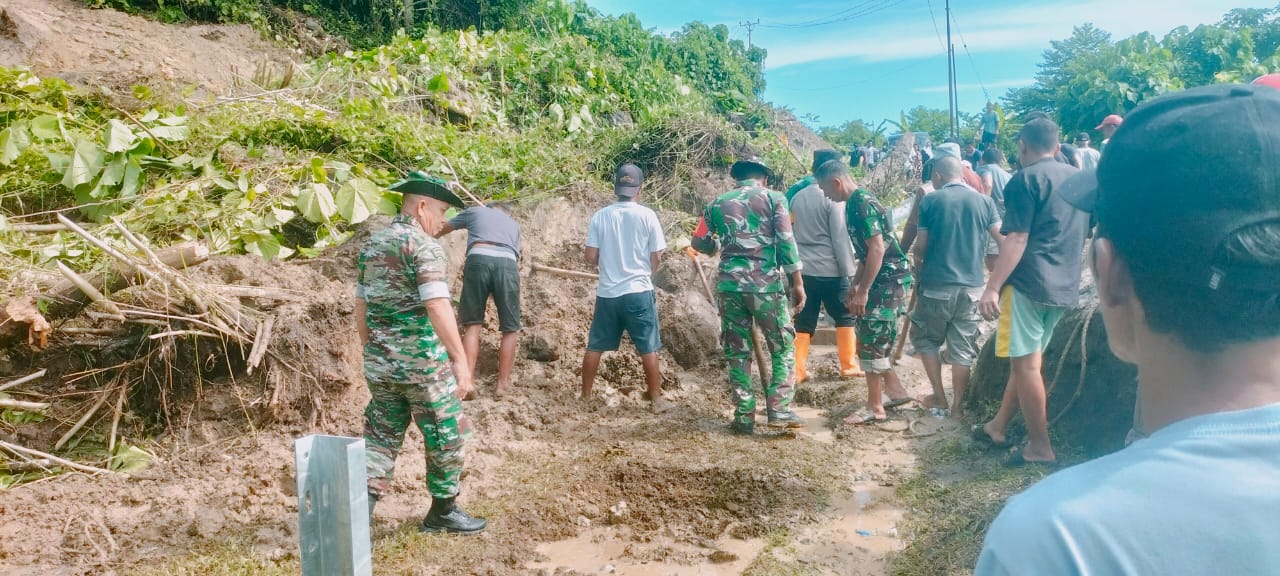 Menanggapi situasi darurat ini, Danramil 1314-03/Sumalata Letda Inf Joni Bernat Siby bersama Babinsanya serta masyarakat setempat, mereka bekerja sama menggunakan alat berat dan peralatan manual untuk menyingkirkan tanah dan bebatuan yang menutupi badan jalan Trans Sulawesi Desa Kasia.
