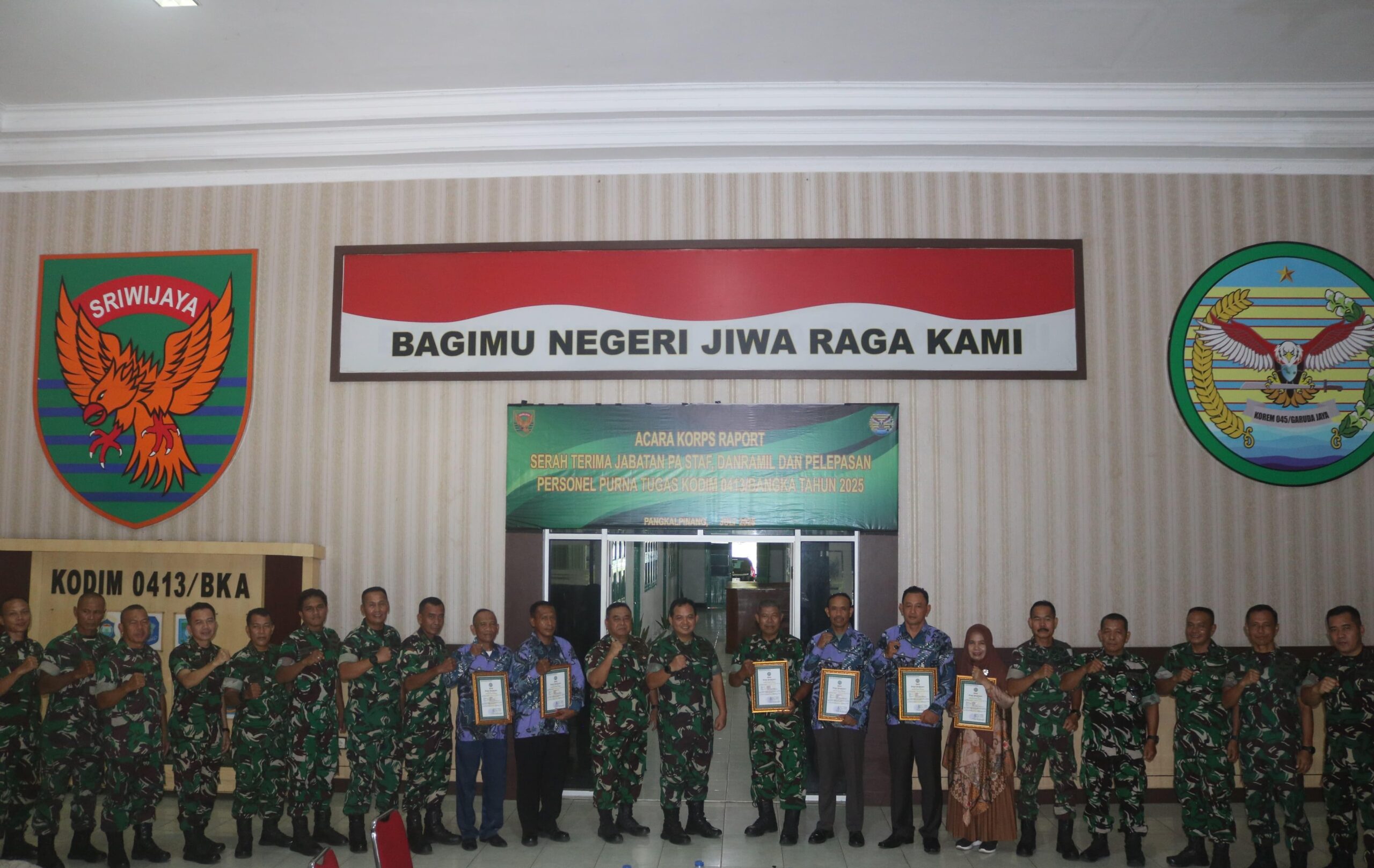 Pangkalpinang, kejarberitanews.com – Komandan Kodim 0413/Bangka Kolonel Inf Ikhsan Agung Widyo Wibowo, S.l.P,. M.H.l. pimpin langsung acara korps raport serah Terima Jabatan Danramil, Pasi, dan pelepasan personil purna tugas bertempat di Koridor Utama Makodim 0413/Bangka, Rabu (02/07/2025)