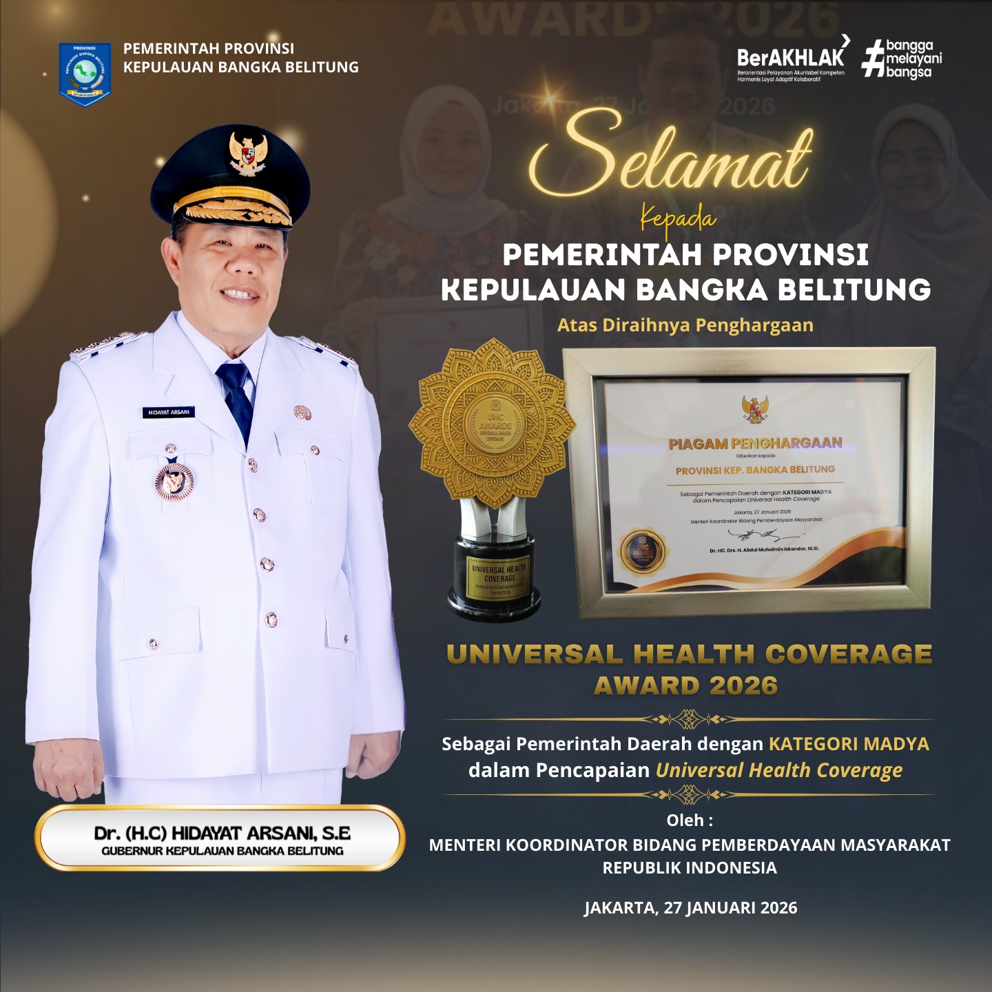 Dengan raihan UHC Award 2026 Kategori Madya, Pemerintah Provinsi Kepulauan Bangka Belitung menegaskan komitmennya di bawah kepemimpinan Gubernur Hidayat Arsani untuk terus menghadirkan pelayanan kesehatan yang inklusif, berkelanjutan, dan berpihak kepada rakyat.
