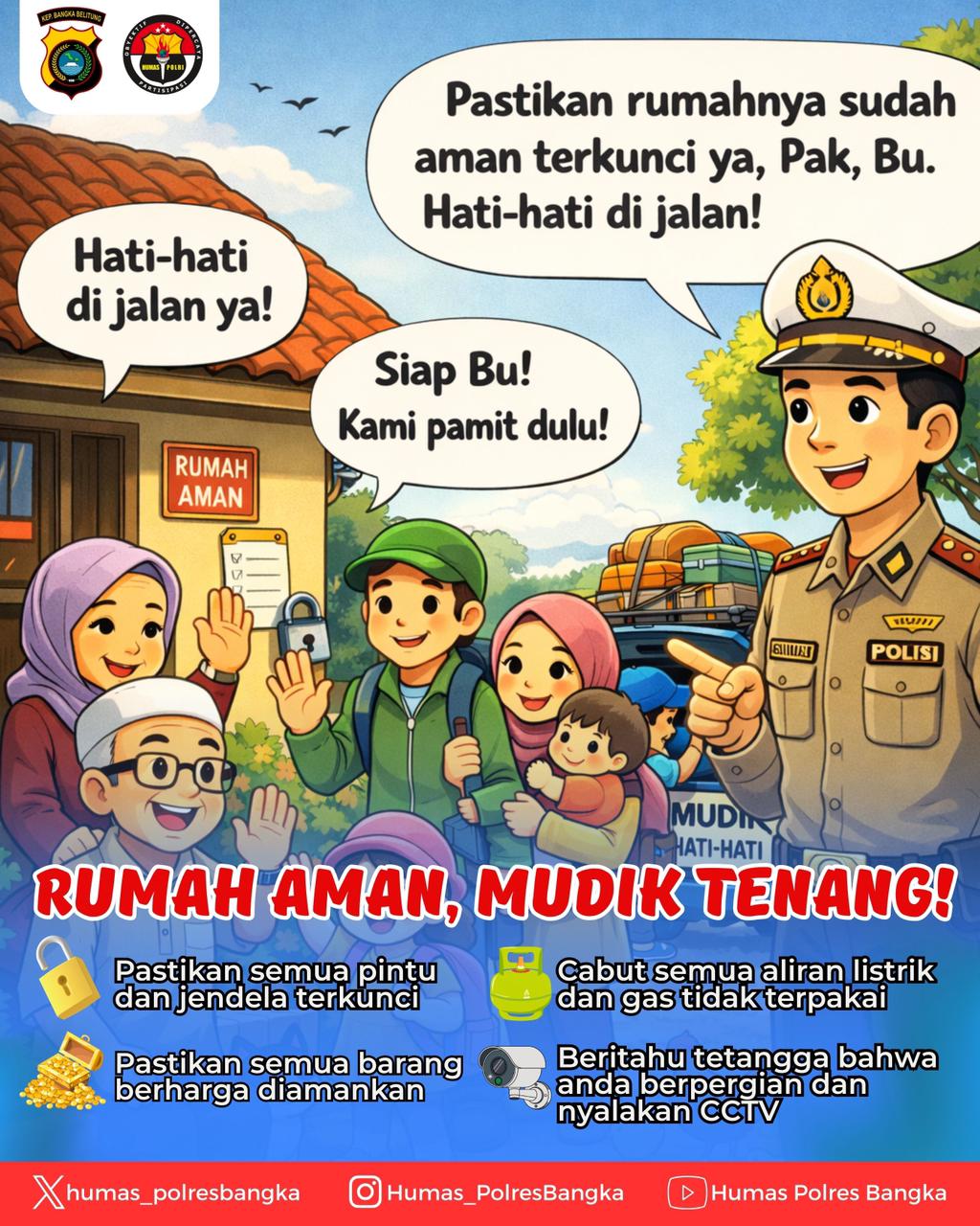Polres Bangka berharap dengan meningkatkan kewaspadaan dan kepedulian terhadap keamanan rumah, masyarakat dapat menjalani perjalanan mudik dengan rasa tenang, aman, dan nyaman bersama keluarga.