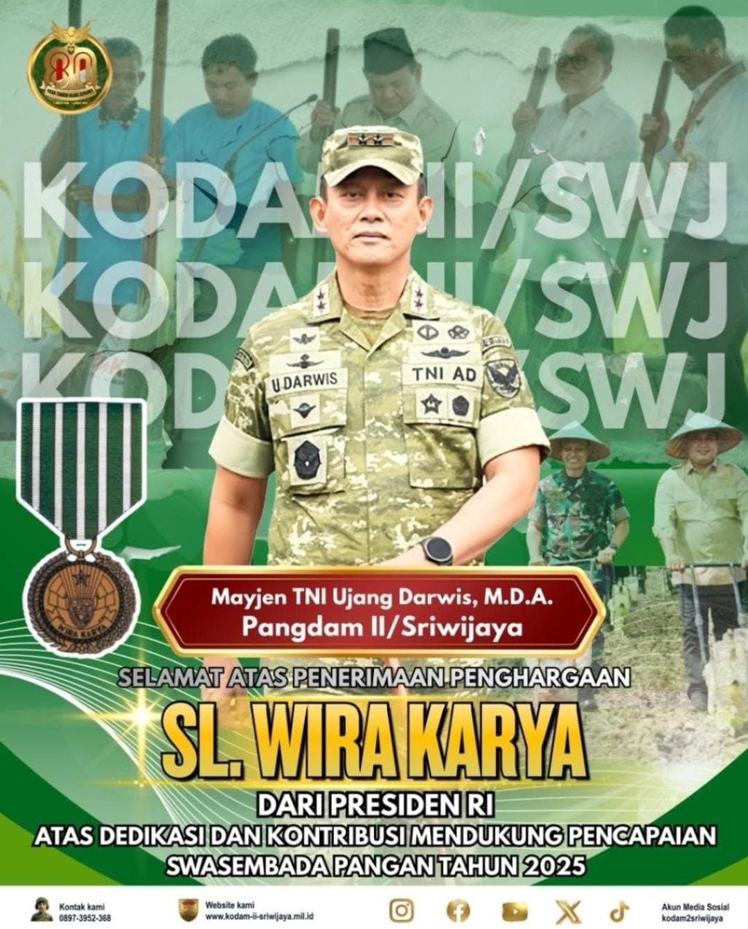 Palembang, kejarberita-news.com — Panglima Komando Daerah Militer (Pangdam) II/Sriwijaya, Mayjen TNI Ujang Darwis, M.D.A., menerima penghargaan Satyalancana (SL) Wira Karya dari Presiden Republik Indonesia. Penghargaan tersebut diberikan sebagai bentuk apresiasi negara atas dedikasi, komitmen, serta kontribusinya dalam mendukung pencapaian program swasembada pangan nasional tahun 2025.